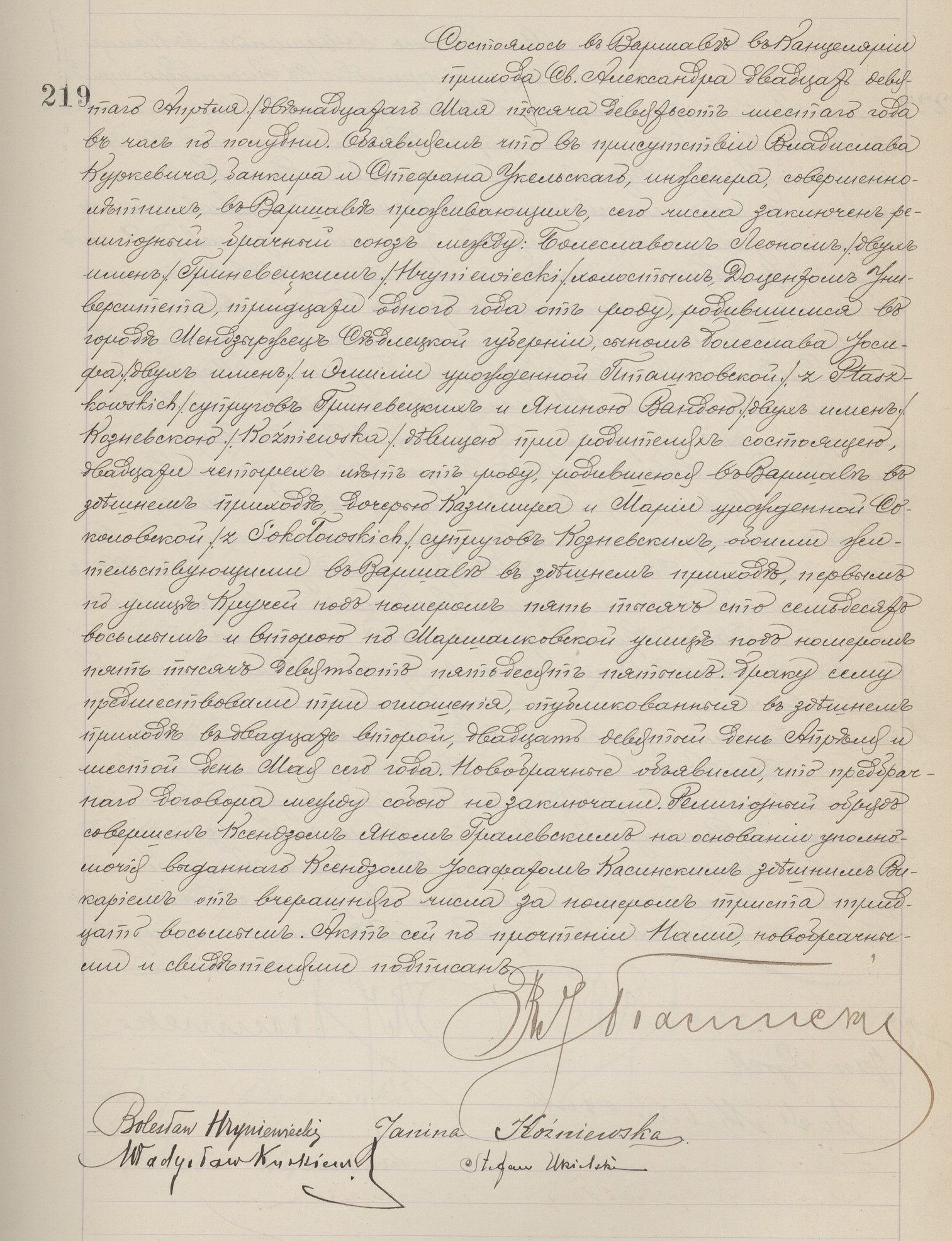 sw.220865 Akt małżeństwa: Warszawa św. Aleksander (obecn. m. Warszawa), 219/1906 [indeks na http://geneteka.genealodzy.pl/] http://metryki.genealodzy.pl/metryka.php?ar=1&zs=0162d&sy=1906b&kt=2&skan=218-219.jpg [podgląd]