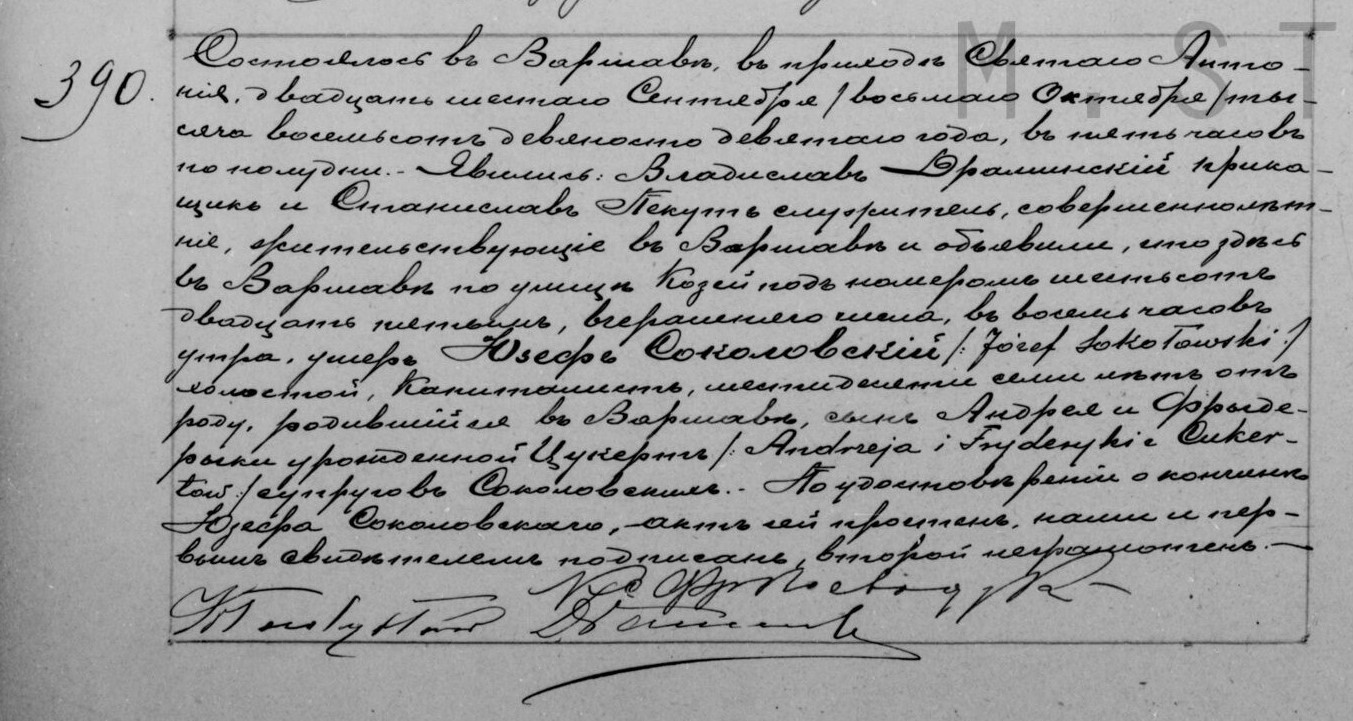 Epitafium na cm. Powązkowskim: Ś.P. JÓZEF SOKOŁOWSKI ŻYŁ LAT 67 ZM. D. 7 PAŹDZIERNIKA 1899 R.