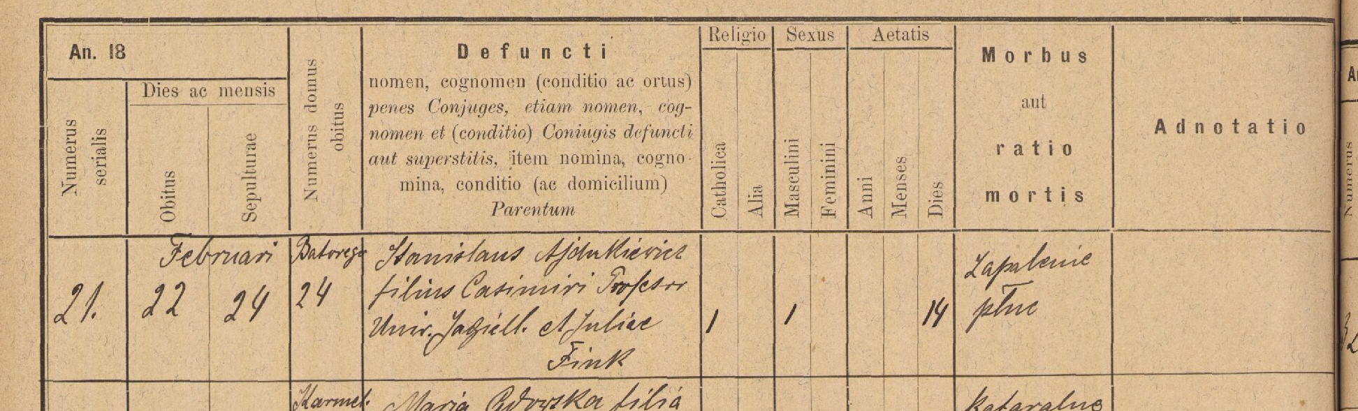 - chrzest: Akt urodzenia: Kraków św. Szczepan, 34/1895 https://szukajwarchiwach.pl/29/331/0/2#tabZespol - zgon: Akt zgonu: Kraków św. Szczepana (obecn. woj. małop.), 240_21/1895 https://szukajwarchiwach.pl/29/331/0/2#tabZespol [podglad]