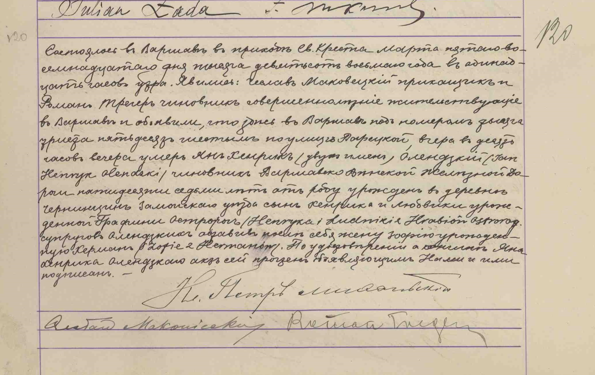 - ślub: Akt małżeństwa: Warszawa-Praga MB Loretańska (obecn. m. Warszawa), rok 1884, nr aktu 109 [indeks na http://geneteka.genealodzy.pl/] http://metryki.genealodzy.pl/metryki.php?op=kt&ar=1&zs=0163d&sy=1884&kt=2 [podgląd] - zgon: Akt zgonu: Warszawa św. Krzyż (obecn. m. Warszawa), 120/1908 http://metryki.genealodzy.pl/metryki.php?op=kt&ar=1&zs=0158d&sy=1908a&kt=3 [podglad]