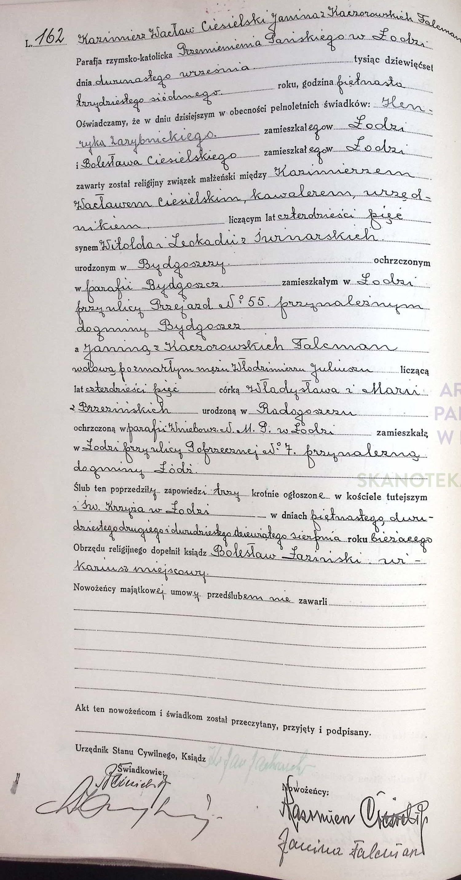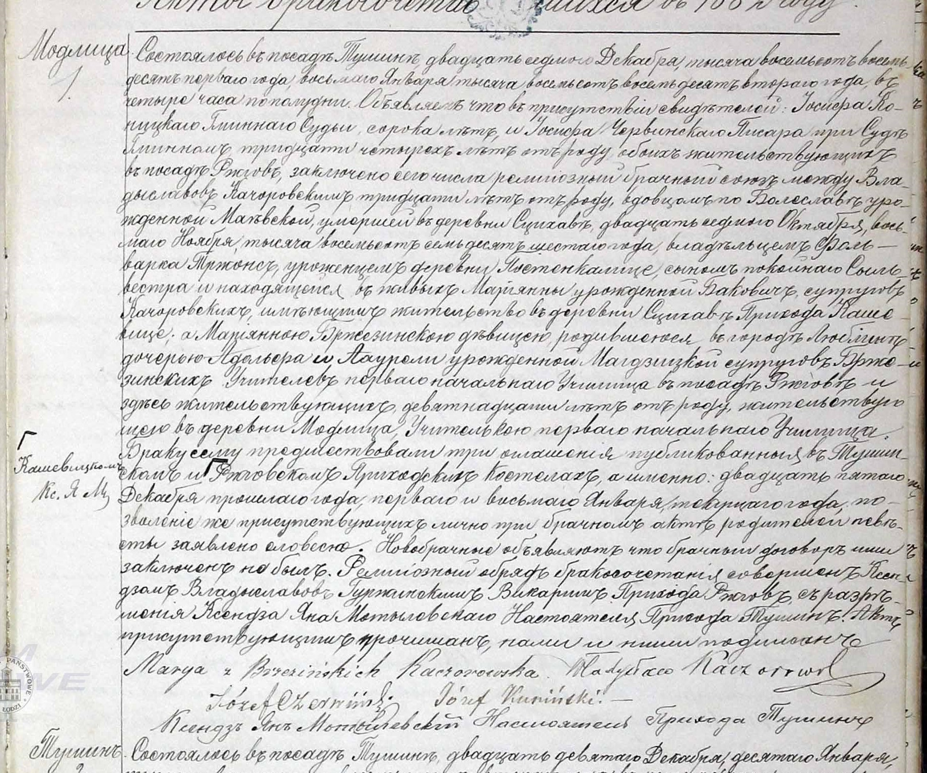 - ślub: Akt małżeństwa: Tuszyn (obecn. woj. łódz.), rok 1882, nr aktu 1 [indeks na http://geneteka.genealodzy.pl/] http://metryki.genealodzy.pl/metryki.php?op=kt&ar=3&zs=1702d&sy=1882&kt=2 [podgląd]