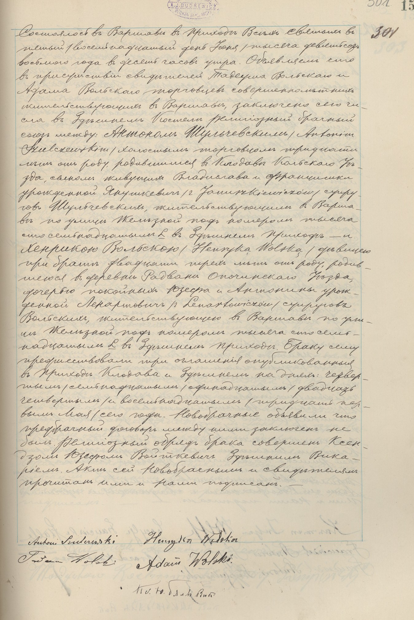 - ślub: Akt małżeństwa: Warszawa Wszystkich Świętych (obecn. m. Warszawa), rok 1908, nr aktu 301 [indeks na http://geneteka.genealodzy.pl/] http://metryki.genealodzy.pl/metryki.php?op=kt&ar=1&zs=1219d&sy=1908c&kt=1 [podgląd]