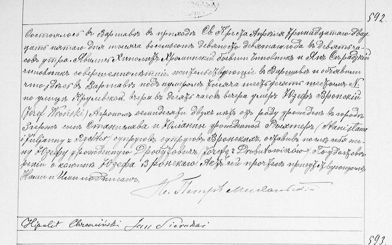 - urodzenie: Akt urodzenia: Zgierz (obecn. woj. łódz.), 122/1827 http://metryki.genealodzy.pl/metryki.php?op=kt&ar=3&zs=1748d&sy=1827&kt=1 - chrzest: Akt urodzenia: Zgierz, 122/1827 http://metryki.genealodzy.pl/metryki.php?op=kt&ar=3&zs=1748d&sy=1827&kt=1 - ślub 1: Akt małżeństwa: Góra św. Małgorzaty (obecn. woj. łódz.), rok 1848, nr aktu 28 [indeks na http://geneteka.genealodzy.pl/] - zgon: Akt zgonu: Warszawa św. Krzyż (obecn. m. Warszawa), 592/1899 http://localhost/mjm/krzyz_1899_161_175_0615.jpg [podglad] - pogrzeb: Urz. M. st.W-wy http://cmentarze.um.warszawa.pl/pomnik.aspx?pom_id=253