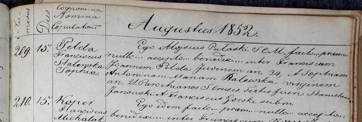 - ślub: Akt małżeństwa: Warszawa św. Krzyż (obecn. m. Warszawa), rok 1852, nr aktu 209 [indeks na http://geneteka.genealodzy.pl/] http://metryki.genealodzy.pl/metryka.php?ar=9&zs=9243d&sy=315&kt=12&skan=1852-320.jpg [podgląd]