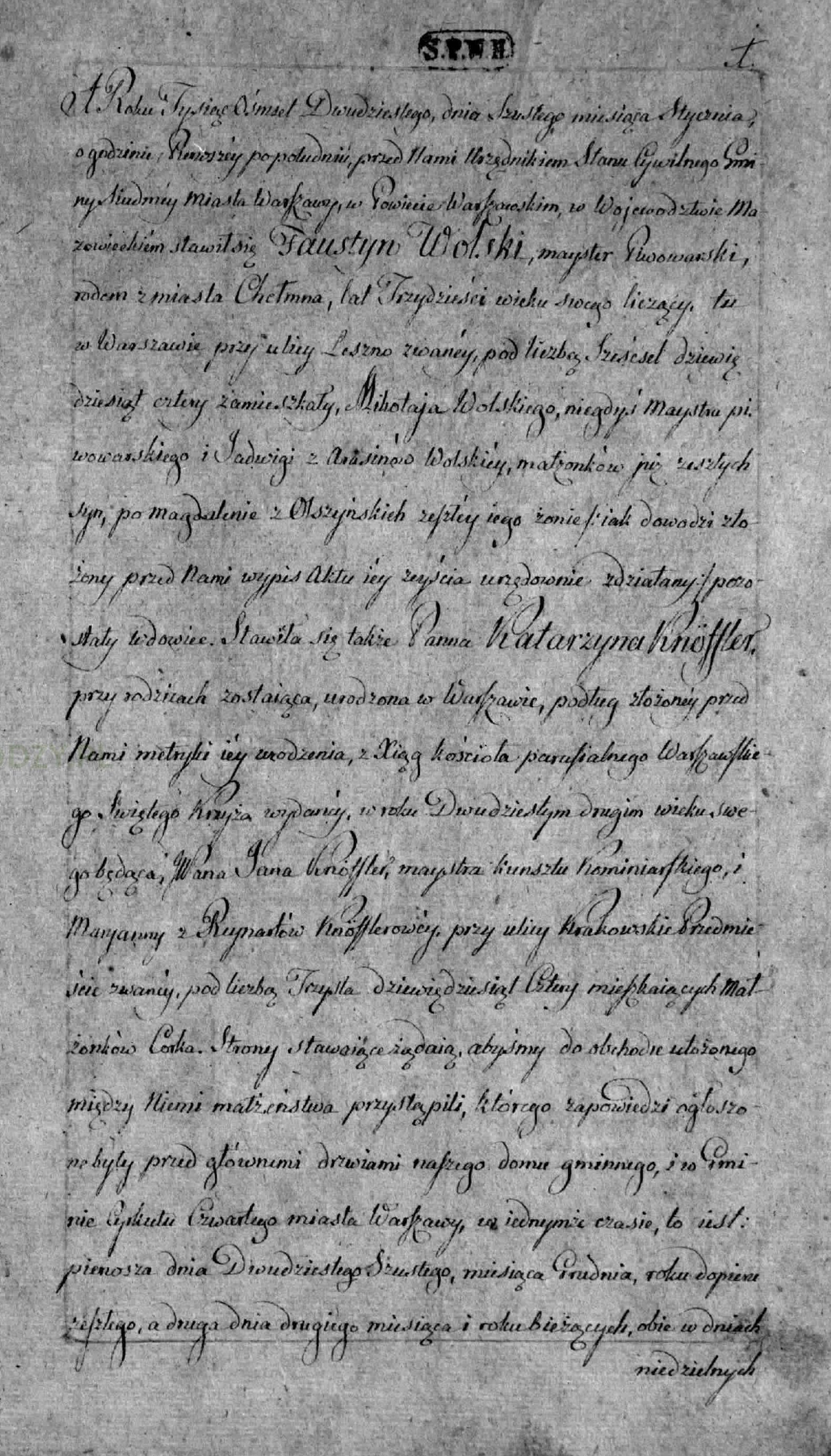 - ślub: Akt małżeństwa: Warszawa ASC Cyrkuł VII (obecn. m. Warszawa), rok 1820, nr aktu 1 [indeks na http://geneteka.genealodzy.pl/] http://metryki.genealodzy.pl/metryka.php?ar=1&zs=0189d&sy=125&kt=2&skan=001.jpg [podgląd]
