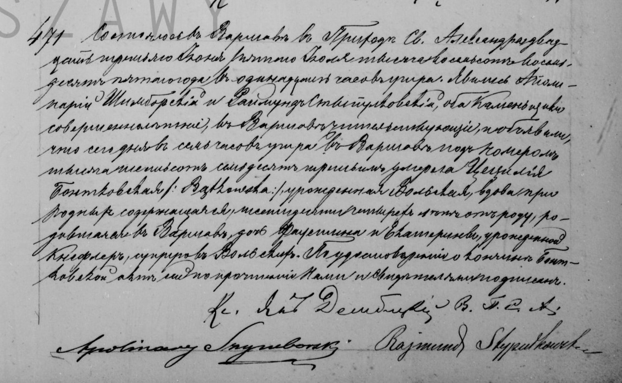 - ślub: Akt małżeństwa: Warszawa św. Krzyż (obecn. m. Warszawa), rok 1844, nr aktu 176 [indeks na http://geneteka.genealodzy.pl/] http://metryki.genealodzy.pl/metryki.php?op=kt&ar=1&zs=0158d&sy=1844&kt=2 [podgląd] - zgon: Akt zgonu: Warszawa św. Aleksander (obecn. m. Warszawa), 471/1885 http://szukajwarchiwach.pl/72/162/0/-/106/str/1/2/100#tabSkany [podglad]