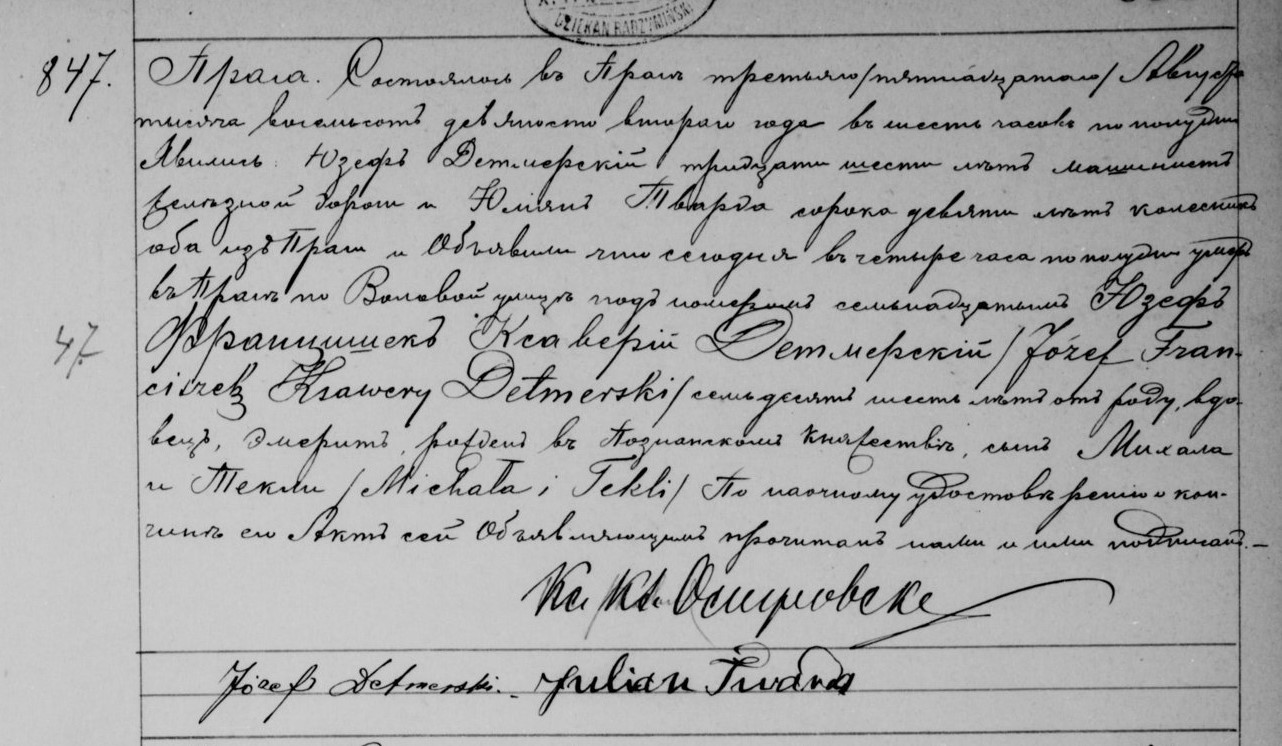 - ślub: Akt małżeństwa: Płock (obecn. woj. mazow.), rok 1853, nr aktu 51 [indeks na http://geneteka.genealodzy.pl/] http://szukajwarchiwach.pl/50/155/0/-/53#tabSkany [podgląd] - zgon: Akt zgonu: Warszawa-Praga MB Loretańska (obecn. m. Warszawa), 847/1892 http://localhost/mjm/loretanska_1892_163_103_0849.jpg [podglad]