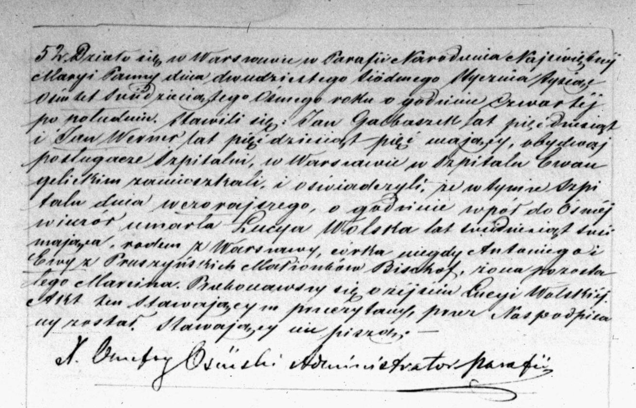 - ślub: Akt małżeństwa: Warszawa ASC Cyrkuł II (obecn. m. Warszawa), rok 1817, nr aktu 101 [indeks na http://geneteka.genealodzy.pl/] https://szukajwarchiwach.gov.pl/jednostka/-/jednostka/12481093 - zgon: Akt zgonu: Warszawa-Leszno Narodzenie NMP (obecn. m. Warszawa), 52/1868 http://localhost/mjm/leszno_1868_1217_1_0279.jpg [podglad]