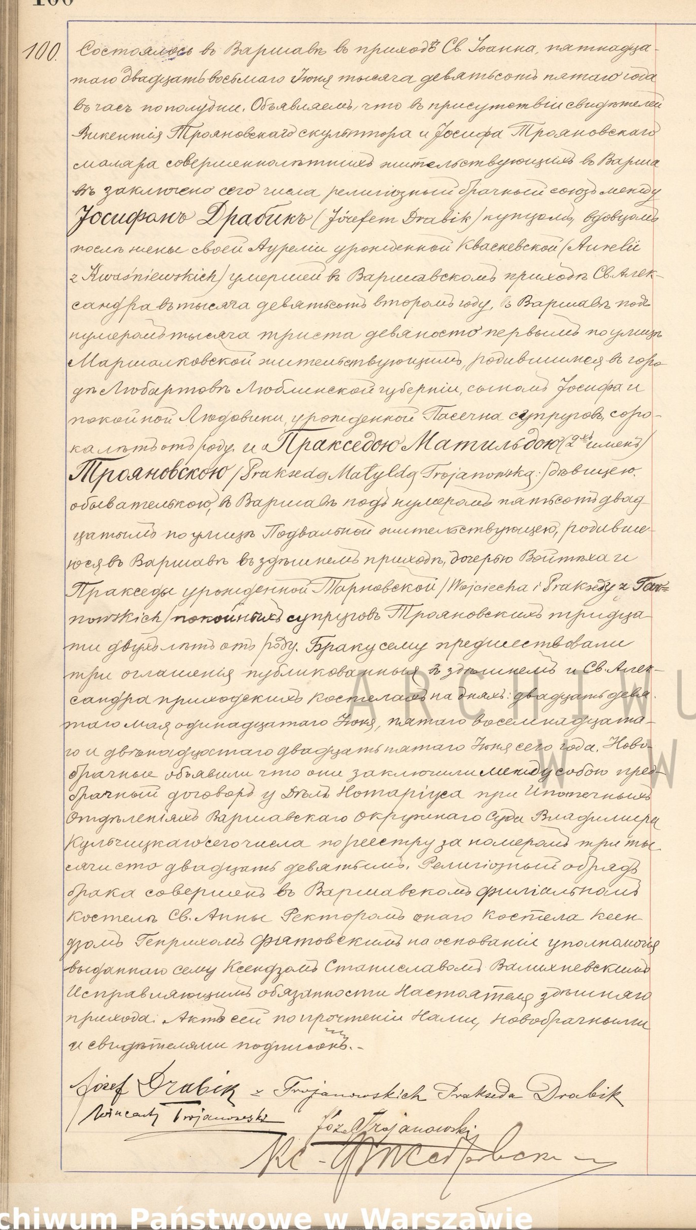 - ślub: Akt małżeństwa: Warszawa św. Jan (obecn. m. Warszawa), rok 1905, nr aktu 100 [indeks na http://geneteka.genealodzy.pl/] http://metryki.genealodzy.pl/metryka.php?ar=8&zs=9233d&sy=342&kt=1&skan=100-101.jpg [podgląd]