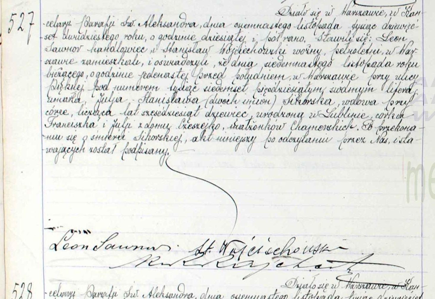 - ślub: Akt małżeństwa: Zamość (obecn. woj. lubel.), rok 1870, nr aktu 11 [indeks na http://lubgens.eu/] http://szukajwarchiwach.pl/88/647/0/-/1/skan/full/7Cg1EhiyDUNukLShMe0IsA [podgląd] - zgon: Akt zgonu: Warszawa św. Aleksander (obecn. m. Warszawa), 527/1920 http://localhost/mjm/aleksander_1920_526-531.jpg [podglad] - pogrzeb: Urz. M. st.W-wy http://cmentarze.um.warszawa.pl/pomnik.aspx?pom_id=27613