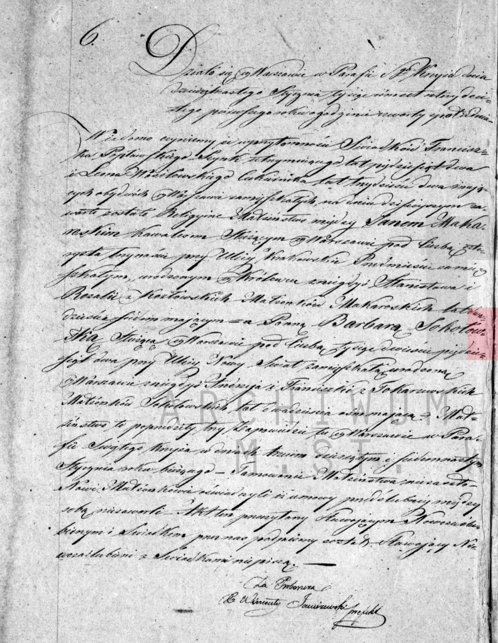 - ślub: Akt małżeństwa: Warszawa św. Krzyż (obecn. m. Warszawa), rok 1841, nr aktu 6 [indeks na http://geneteka.genealodzy.pl/] http://metryki.genealodzy.pl/metryki.php?op=kt&ar=1&zs=0158d&sy=1841&kt=2 [podgląd]