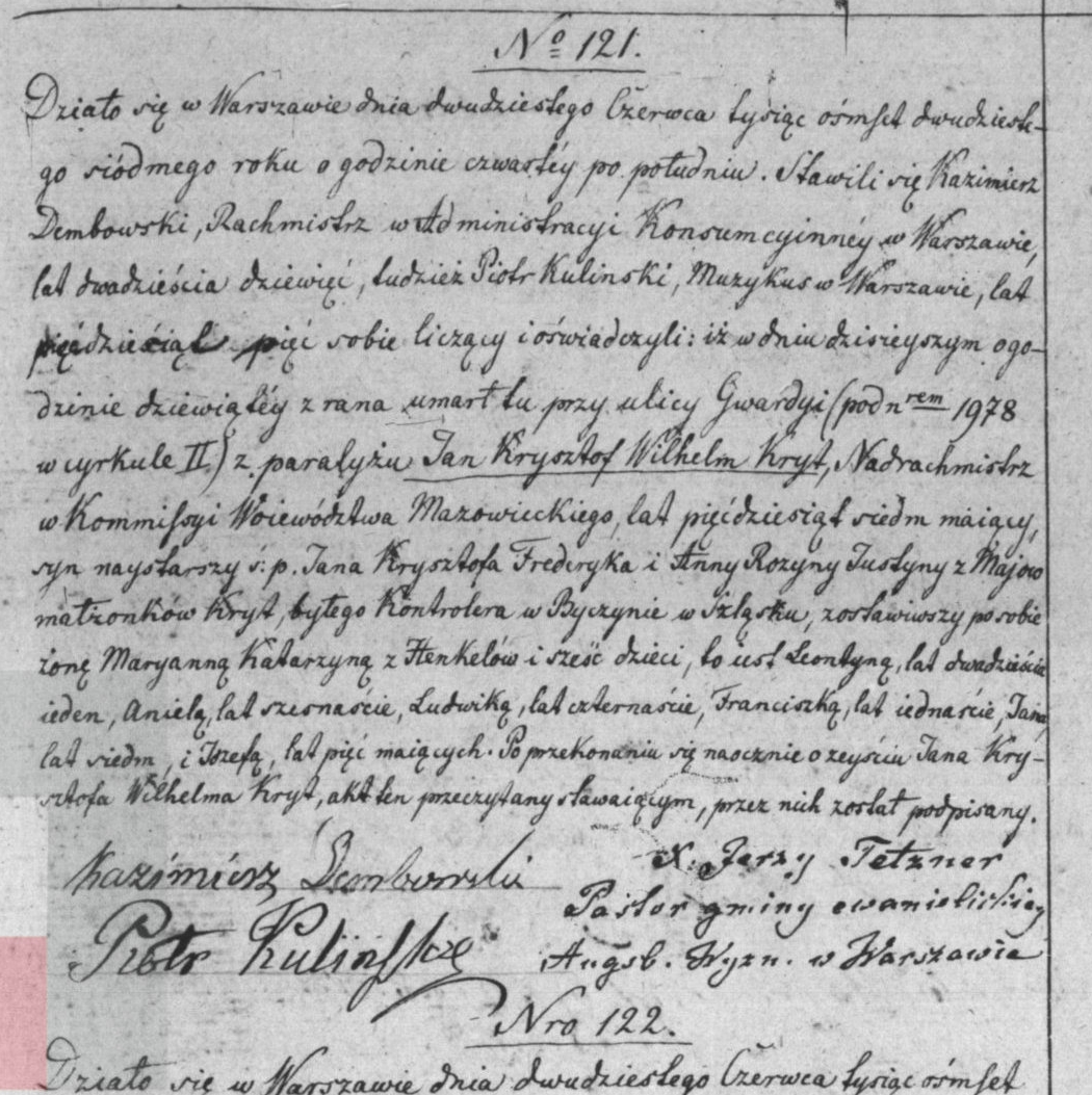 - zgon: Akt zgonu: Warszawa, par. Ewangelicko-Augsburska (obecn. m. Warszawa), 121/1827 http://szukajwarchiwach.pl/72/181/0/-/1/skan/full/Go-ju58tBRn3fr5rNsllGw [podglad]