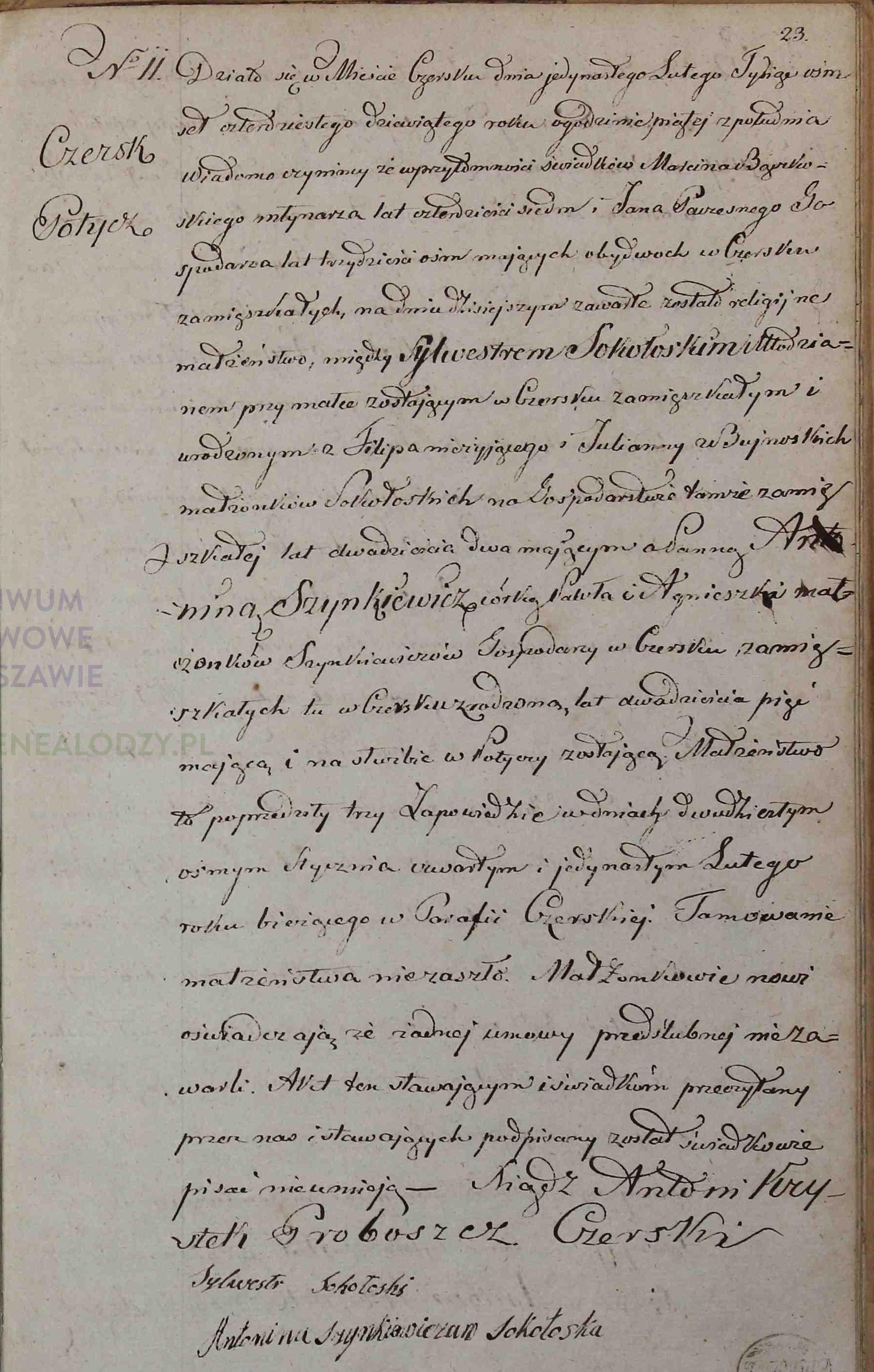 - ślub: Akt małżeństwa: Czersk (obecn. woj. mazow.), rok 1849, nr aktu 11 [indeks na http://geneteka.genealodzy.pl/] http://metryki.genealodzy.pl/metryki.php?op=kt&ar=2&zs=1348d&sy=1849&kt=2 [podgląd]