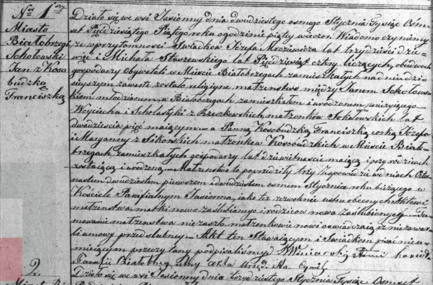 - chrzest: Akt urodzenia: Białobrzegi, 2/1836 http://szukajwarchiwach.pl/58/124/0/1/15/skan/full/5uswryJu0ApzYVcOF6zUbw - ślub: Akt małżeństwa: Białobrzegi (obecn. woj. mazow.), rok 1855, nr aktu 1 [indeks na http://geneteka.genealodzy.pl/] http://szukajwarchiwach.pl/58/124/0/1/34/skan/full/yD_N2CH4hl_7FF3PNvsoAg [podgląd]