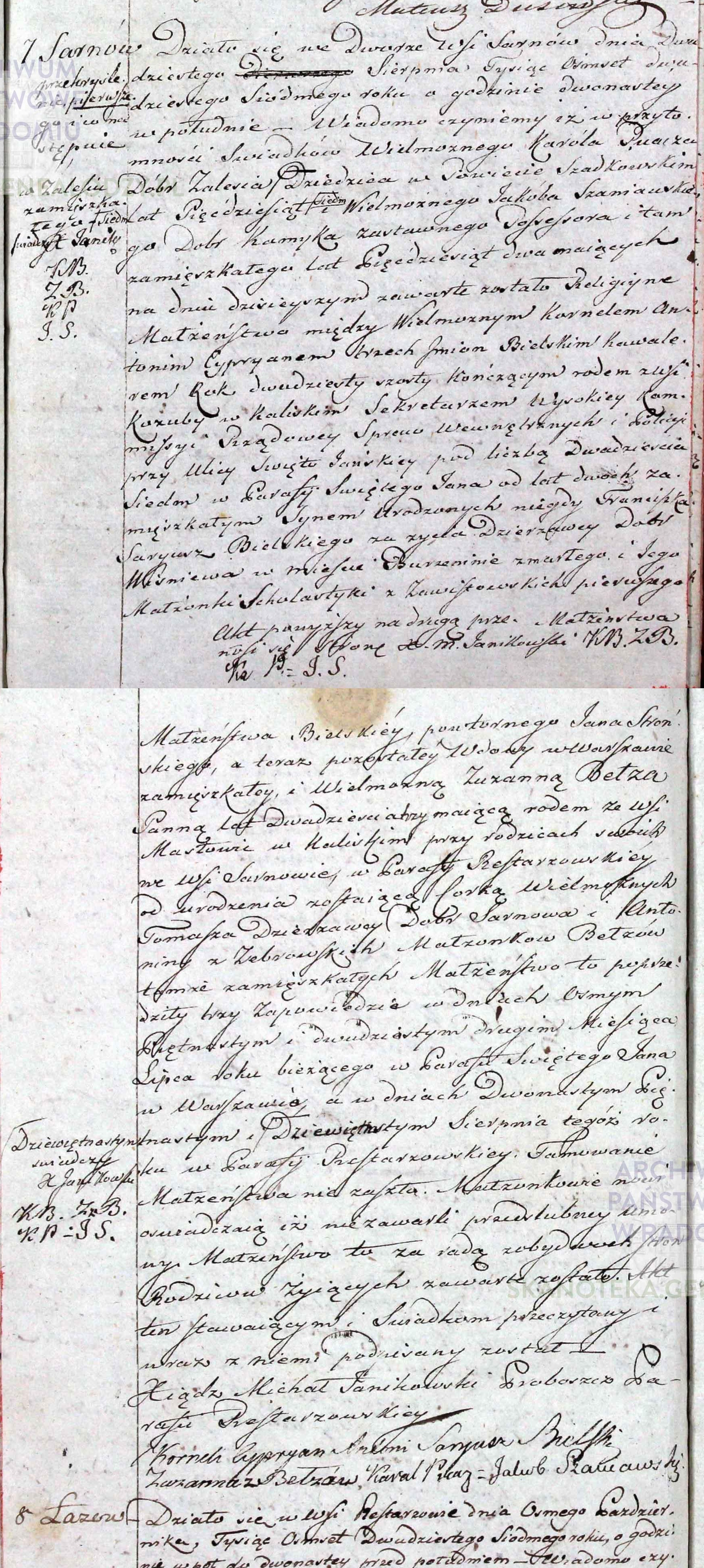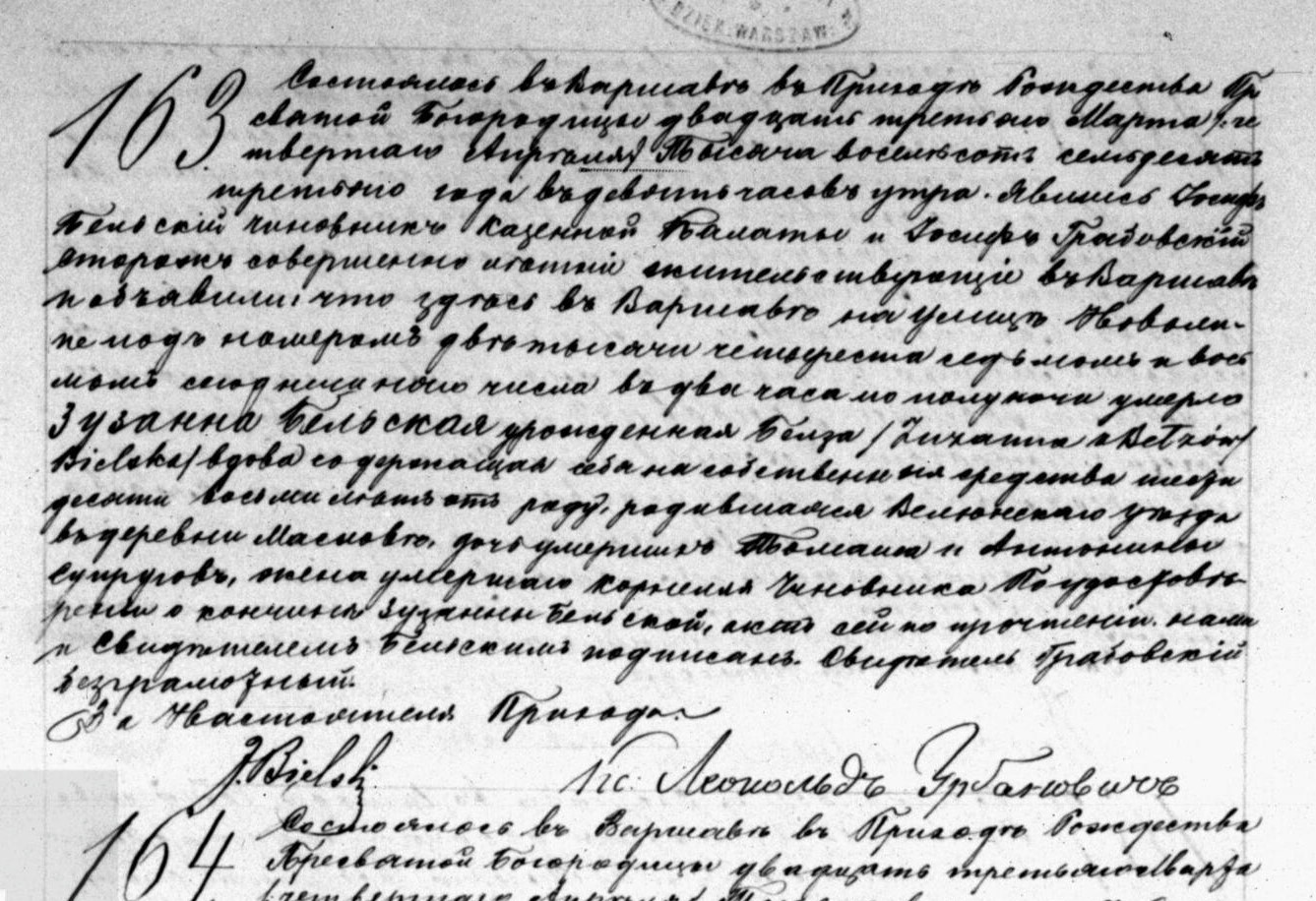 - ślub: Akt małżeństwa: Restarzew (obecn. woj. łódz.), rok 1827, nr aktu 7 [indeks na http://geneteka.genealodzy.pl/] http://metryki.genealodzy.pl/metryki.php?op=kt&ar=3&zs=1646d&sy=1827&kt=2 [podgląd] - zgon: Akt zgonu: Warszawa-Leszno Narodzenie NMP (obecn. m. Warszawa), 163/1873 http://localhost/mjm/leszno_1873_1217_5_0347.jpg [podglad]