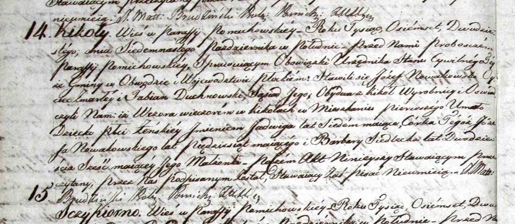 - ślub: Akt małżeństwa: Pomiechowo (obecn. woj. mazow.), rok 1820, nr aktu 14 [indeks na http://geneteka.genealodzy.pl/] http://metryki.genealodzy.pl/metryki.php?op=kt&ar=2&zs=0688d&sy=1820&kt=3 [podgląd]
