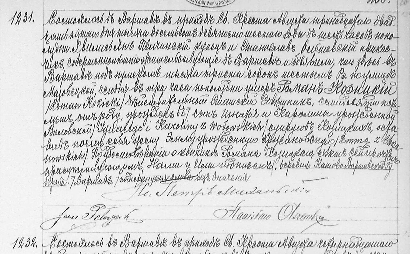 | genetekaz.11419107 | 25 | aug | 1896 | | xpar.1450 | Akt zgonu: Warszawa św. Krzyż (obecn. m. Warszawa), 1231/1896 http://localhost/mjm/krzyz_1896_161_130_0411.jpg [podglad] | | Akt zgonu obecny w bazie Geneteka |