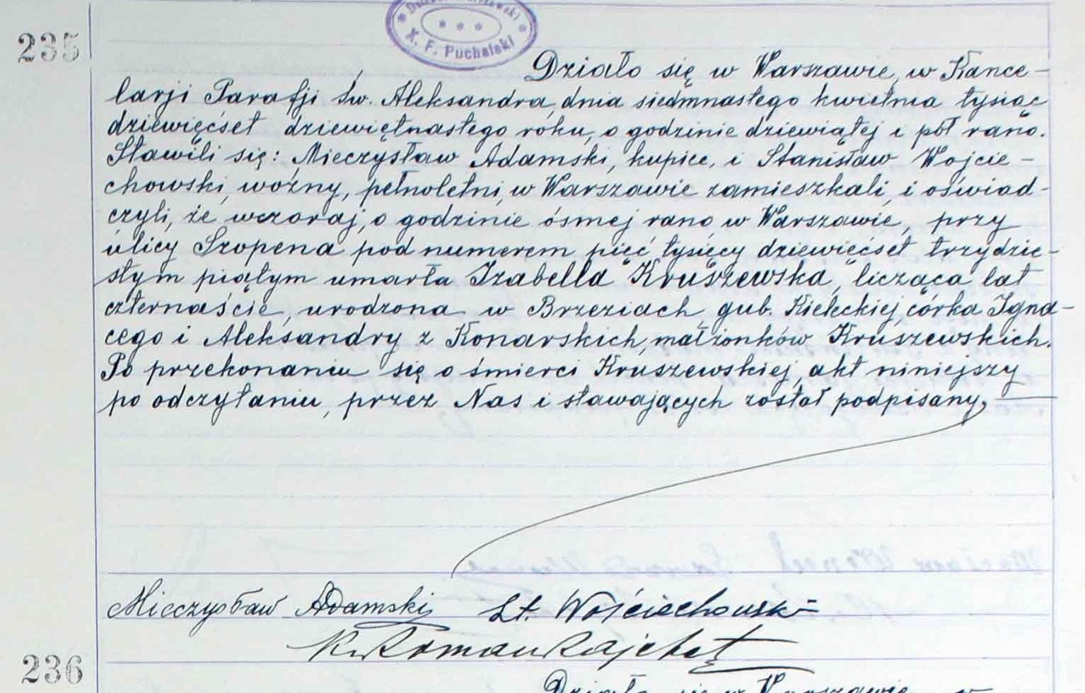 | genetekaz.11455653 | 16 | apr | 1919 | | xpar.1442 | Akt zgonu: Warszawa św. Aleksander (obecn. m. Warszawa), 235/1919 http://localhost/mjm/aleksander_1919_232-237.jpg [podglad] | | Akt zgonu obecny w bazie Geneteka |