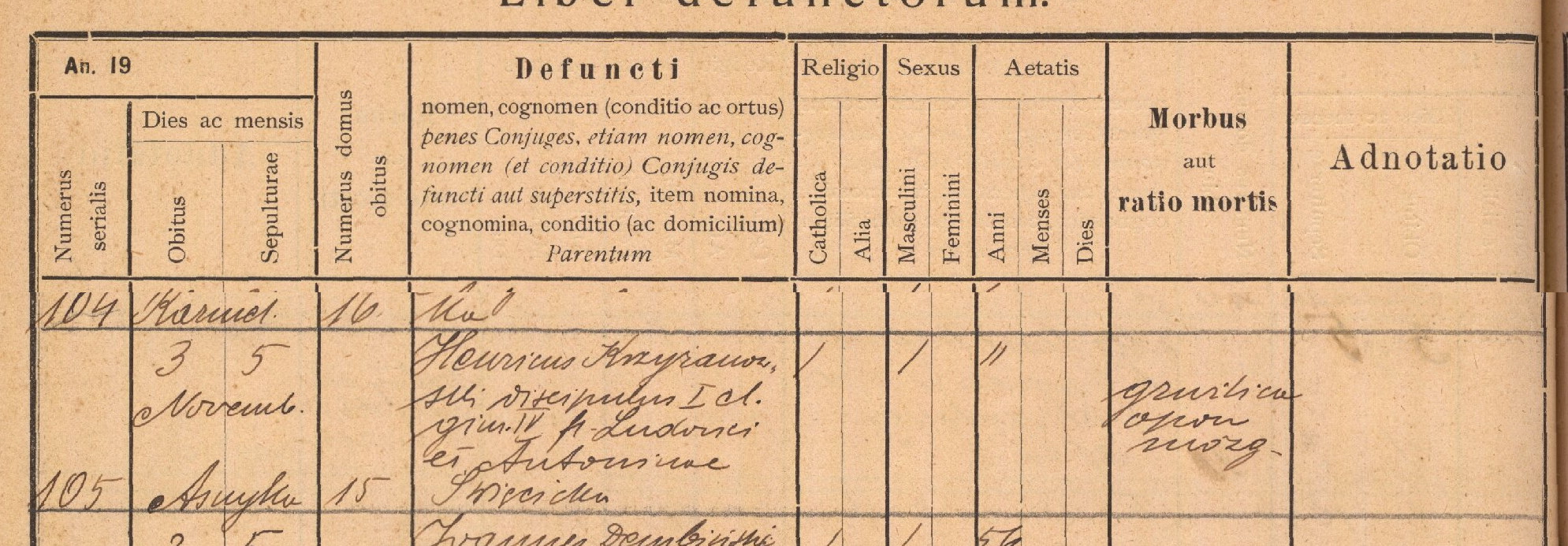 | sw.1085826 | sw.1085826 | 13.109.275 (13.109.275) | 13.109.277 (13.109.277) | Akt zgonu: Kraków św. Szczepana (obecn. woj. małop.), 585_105/1902 [indeks na http://geneteka.genealodzy.pl/] https://szukajwarchiwach.pl/29/331/0/2#tabZespol [podgląd] |