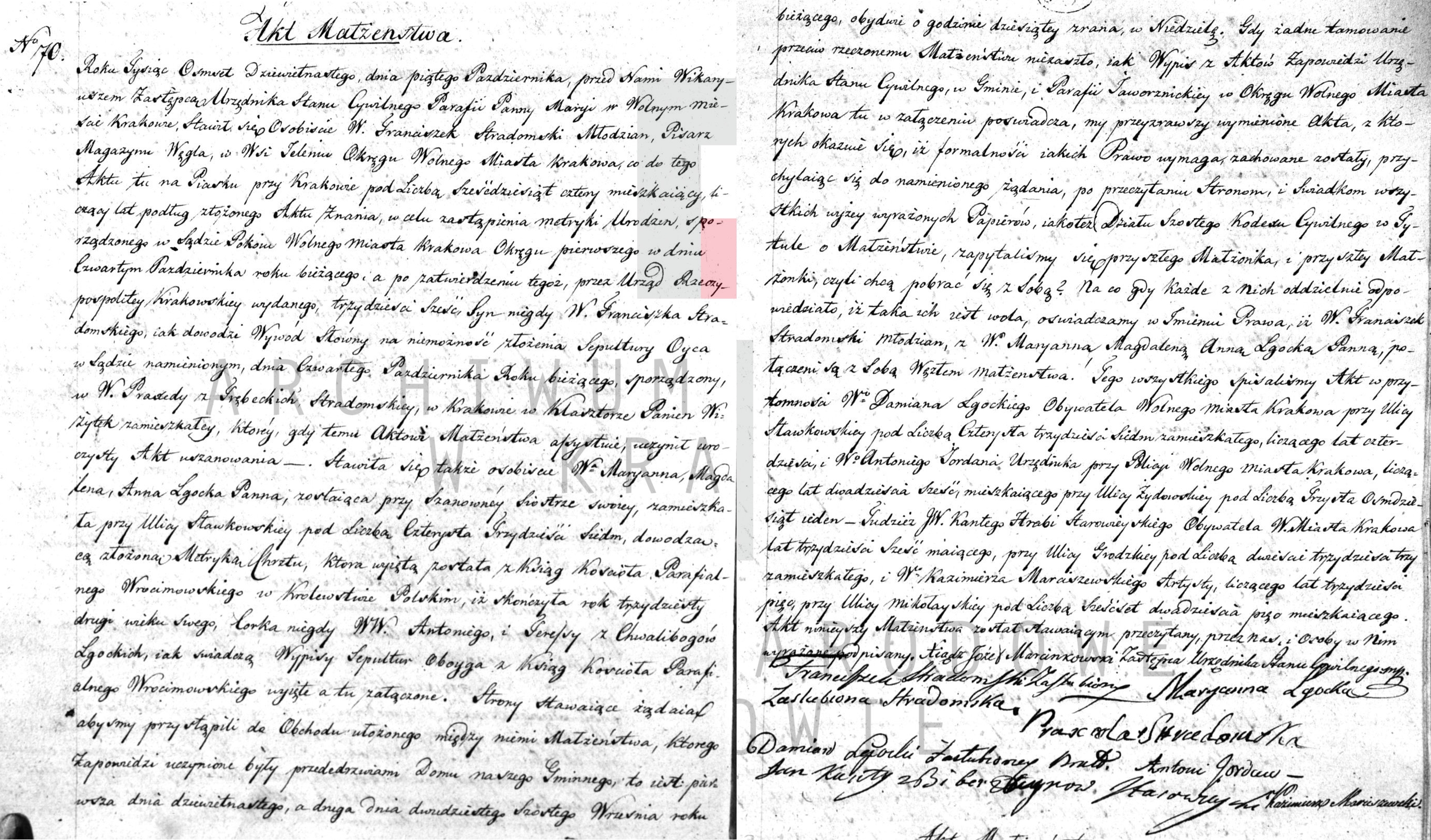 | 14.275.200 | sw.478150 | sw.478151 (14.275.192) | sw.478152 (14.275.196) | Akt małżeństwa: Kraków WNMP (Mariacki) (obecn. woj. małop.), 70/1819 [indeks na http://geneteka.genealodzy.pl/] http://szukajwarchiwach.pl/29/328/0/2/35/skan/full/mIKpynNvm1NUuSw4B9oqYw [podgląd] |
