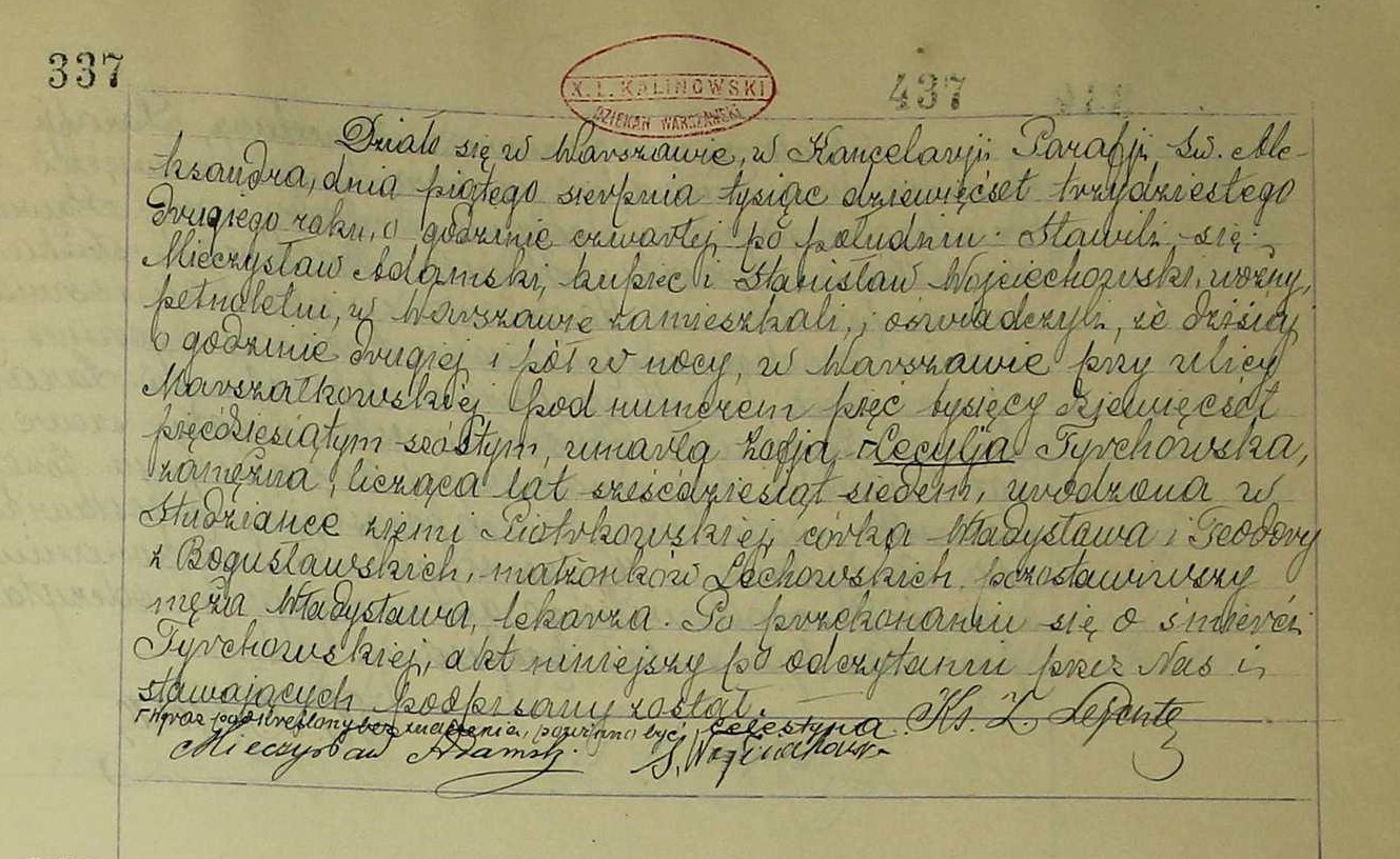 | 14.57.16 | sw.161634 (sw.161634) | 1892 | xpar.1454 | Akt małżeństwa: Warszawa Wszystkich Świętych (obecn. m. Warszawa), rok 1892, nr aktu 272 [indeks na http://geneteka.genealodzy.pl/] http://metryki.genealodzy.pl/metryka.php?ar=8&zs=9264d&sy=316&kt=1&skan=272.jpg [podgląd] | Akt ślubu obecny w bazie Geneteka | |||||
