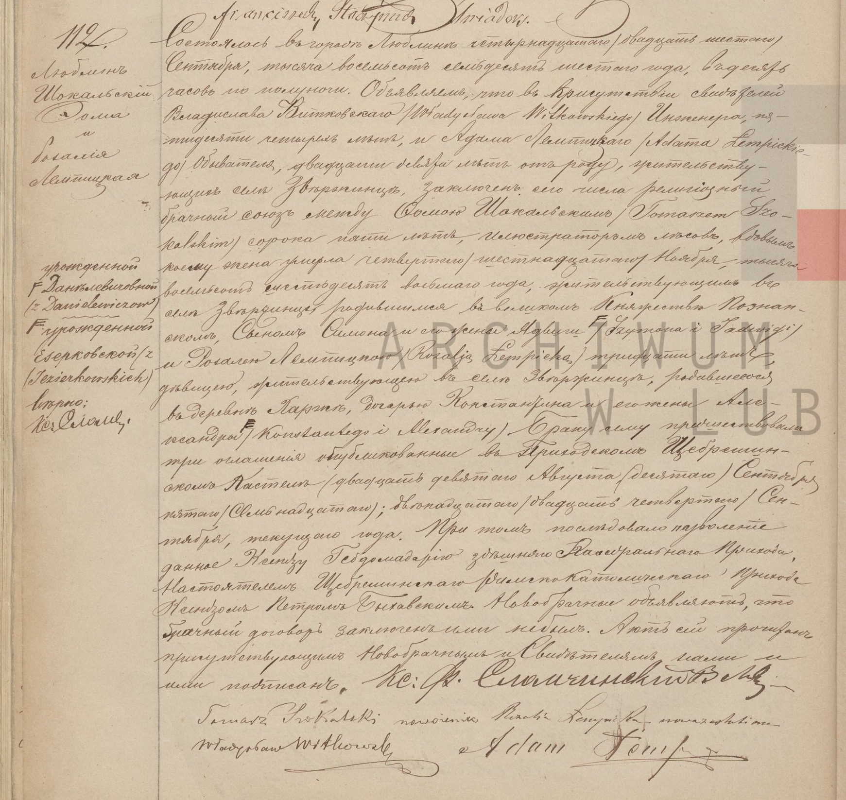 | sw.703894 | sw.703894 | 15.431.939 (15.431.939) | 15.431.940 (15.431.940) | Akt małżeństwa: Lublin (św. Jana) (obecn. woj. lubel.), 112/1876 [indeks na http://lubgens.eu/] https://szukajwarchiwach.pl/35/1859/0/2.4/59/skan/full/_IpbEZtSA-V3yrjoWqvZFA [podgląd] |