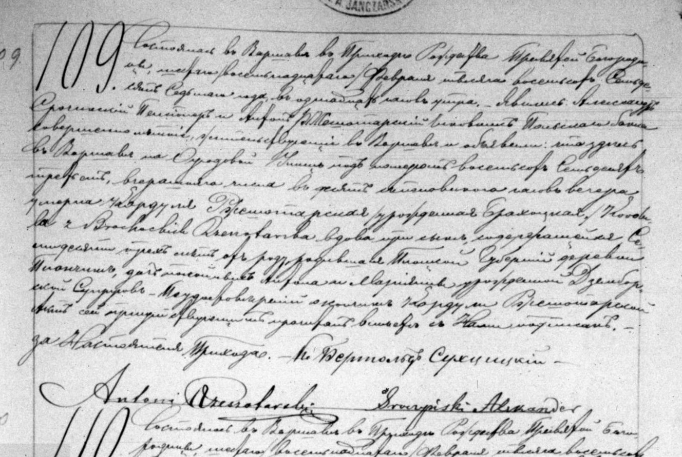 | 2.300.112 | sw.366817 | 2.300.107 (2.300.90) | my.a1336 (my.a1336) | Akt małżeństwa: Lekowo (obecn. woj. mazow.), 2/1816 [indeks na http://geneteka.genealodzy.pl/] |