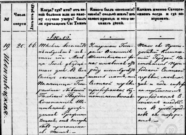 | sw.464261 | 20 | jul | 1855 | Sielec, par. Sielec, Wołyń | Akt zgonu: Sielec, 19/1855 http://agadd.home.net.pl/metrykalia/436/sygn.%20587/pages/PL_1_436_587_0019.htm | |||