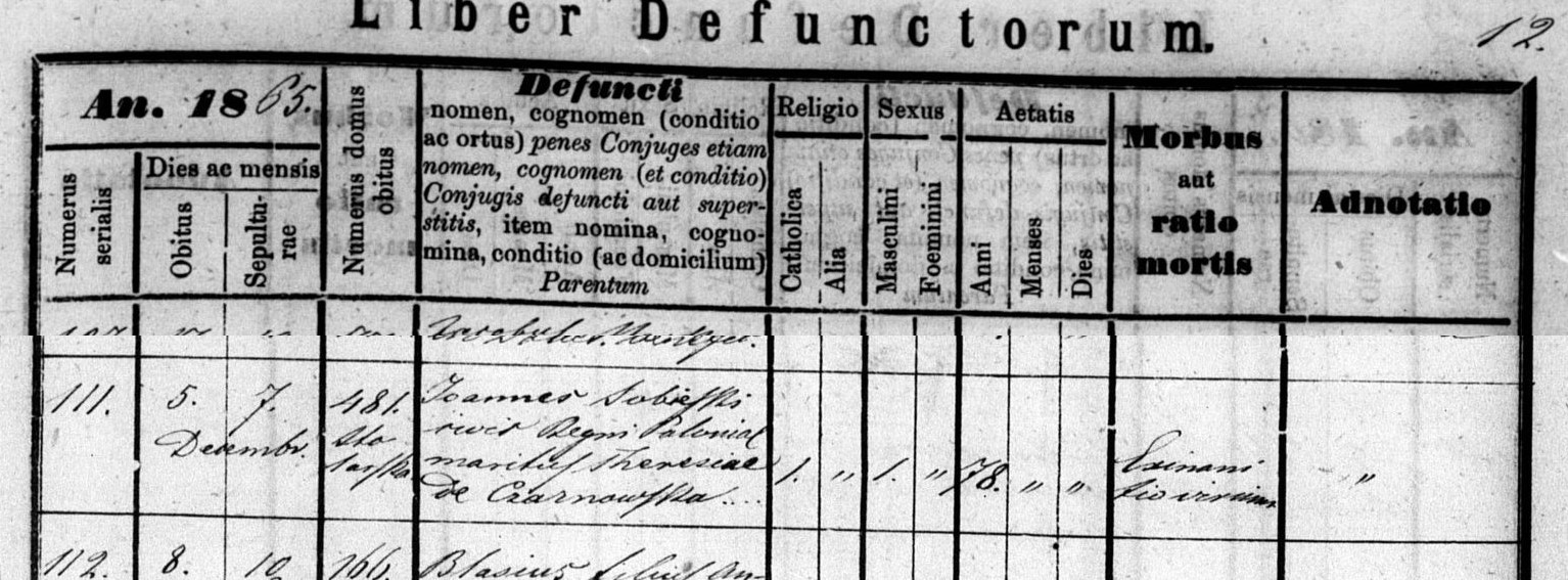 | insertonline.6123 | 5 | dec | 1865 | | xpl.krakow | Kurier W-wski nr 281 z 11.12.1865:Dnia 5 b. m. w Krakowie, zakończył życie . p. Jan Sobieski, Obywatel tutejszy i K. W=wski nr 9 z 12.01.1866:Dzi, () odbyło się żałobne Nabożeństwo za duszę zmarłego przed miesišcem w Krakowie . p. Jana Sobieskiego, starożytnej rodziny Janinów ostatniego potomka. Urodzony w r. 1790, z Józefa i Hilarji z Bujnów -- Informacja p. Jana Leopolda (z 12.12.2013) | | Uzupełnienia użytkowników wprowadzane online |