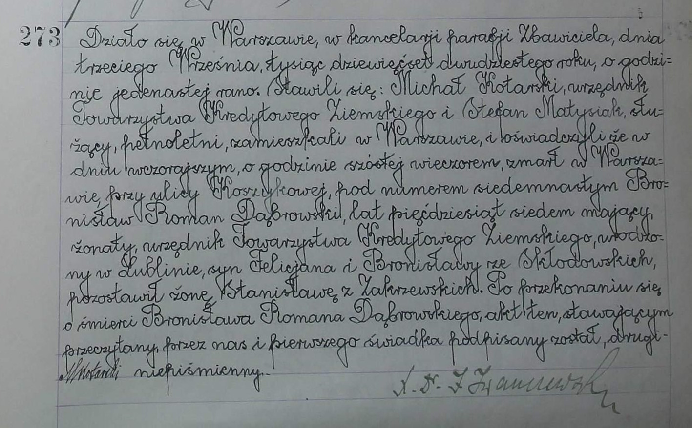 | sw.1078803 | m | Felicjan | Dąbrowski | Akt zgonu: Warszawa Najświętszego Zbawiciela (obecn. m. Warszawa), 273/1920 [indeks na http://geneteka.genealodzy.pl/] http://localhost/mjm/zbawiciel_1920_268-273.jpg [podgląd] | ||||||||