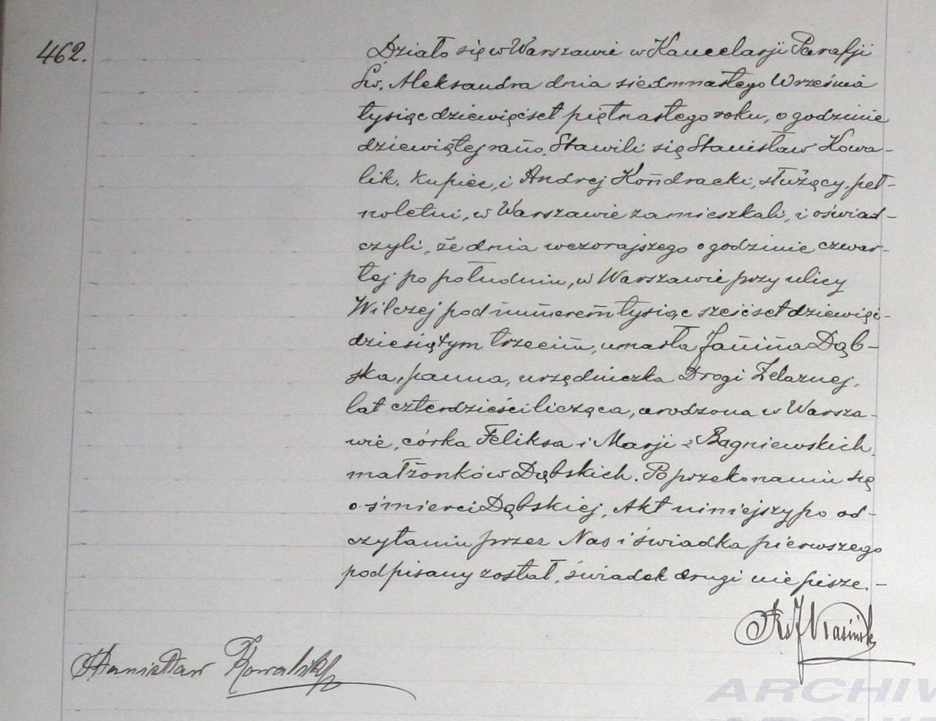 | genetekaz.11453506 | 16 | sep | 1915 | xpar.1442 | Akt zgonu: Warszawa św. Aleksander (obecn. m. Warszawa), 462/1915 http://localhost/mjm/aleksander_1915_462-465.jpg [podglad] | Akt zgonu obecny w bazie Geneteka | ||