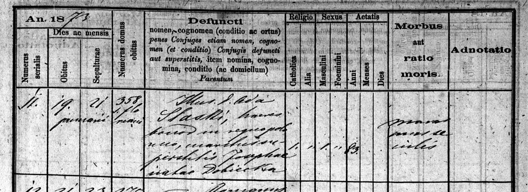 | genetekaz.11766800 | 19 | jan | 1873 | | xpar.481 | Akt zgonu: Kraków, par. Mariacka (obecn. woj. małop.), 11/1873 [podglad] | | Akt zgonu obecny w bazie Geneteka |