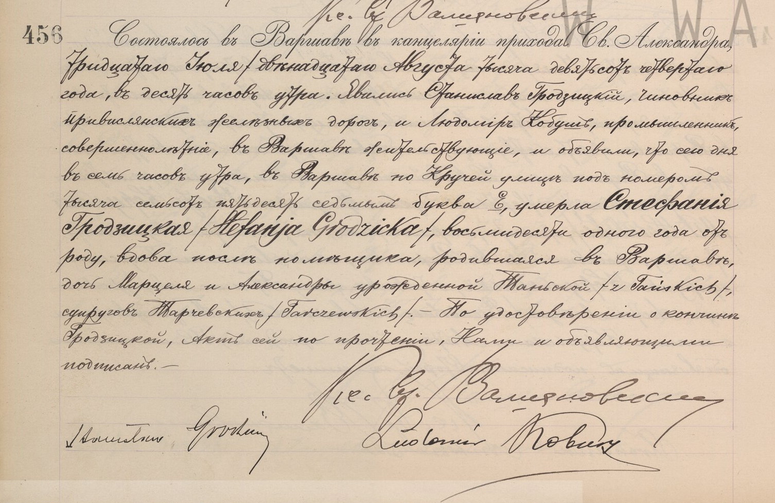 | genetekaz.11341410 | 12 | aug | 1904 | | xpar.1442 | Akt zgonu: Warszawa św. Aleksander (obecn. m. Warszawa), 456/1904 http://localhost/mjm/aleksander_1904_159_32_0361.jpg [podglad] | | Akt zgonu obecny w bazie Geneteka |