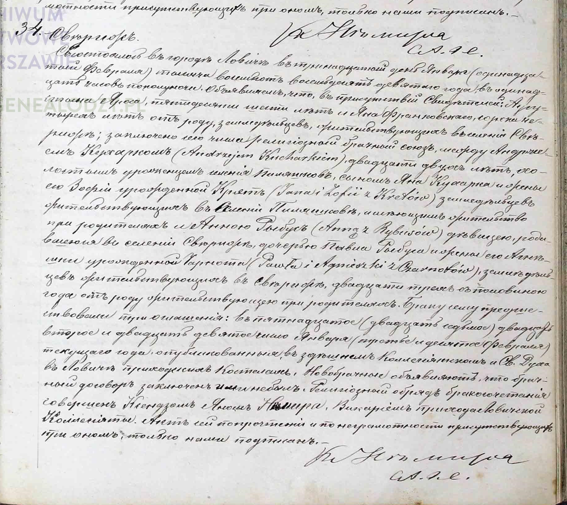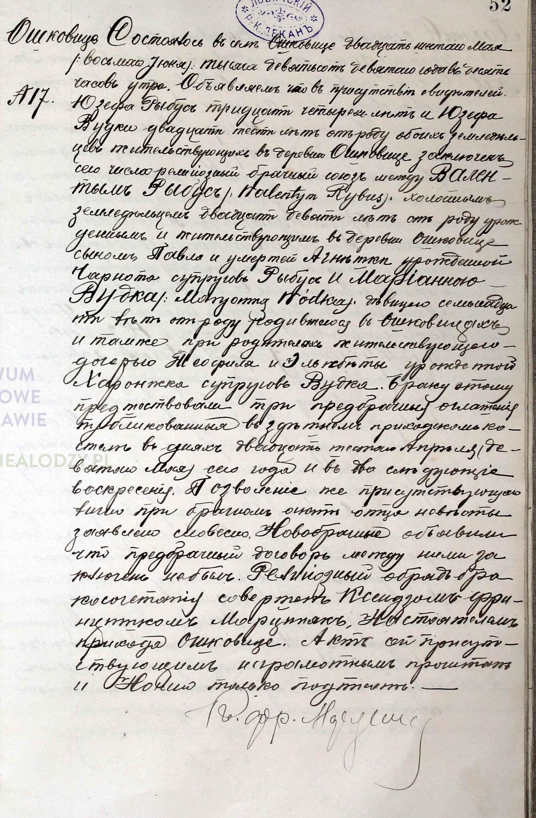 | gr.4349 | sw.407831 | sw.407832 (gr.4376) | sw.407833 (gr.5264) | Akt małżeństwa: Oszkowice (obecn. woj. łódz.), 2/1904 [indeks na http://geneteka.genealodzy.pl/] http://metryki.genealodzy.pl/metryka.php?ar=11&zs=0189d&sy=1904&kt=2&skan=02-03.jpg [podgląd] |