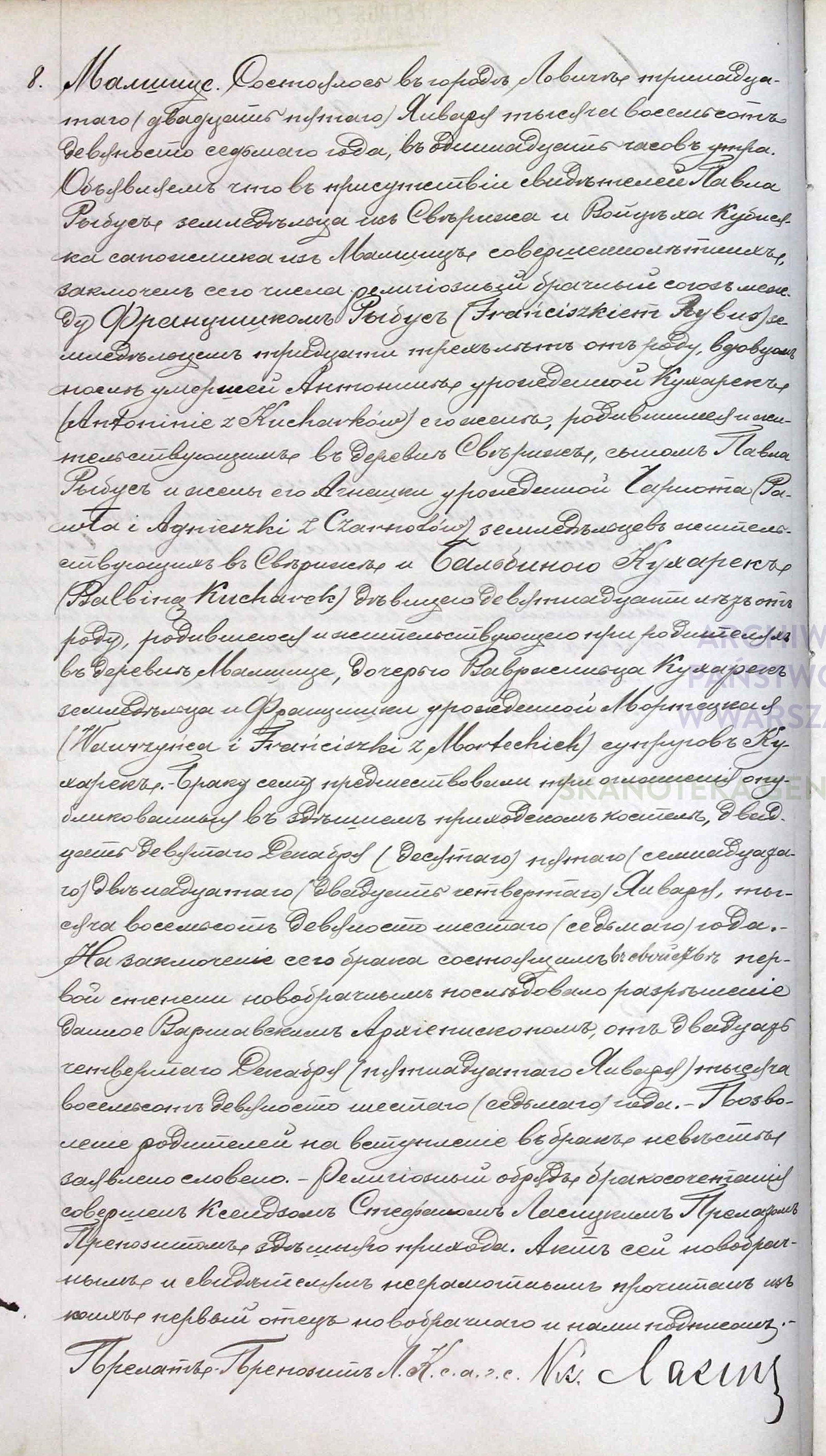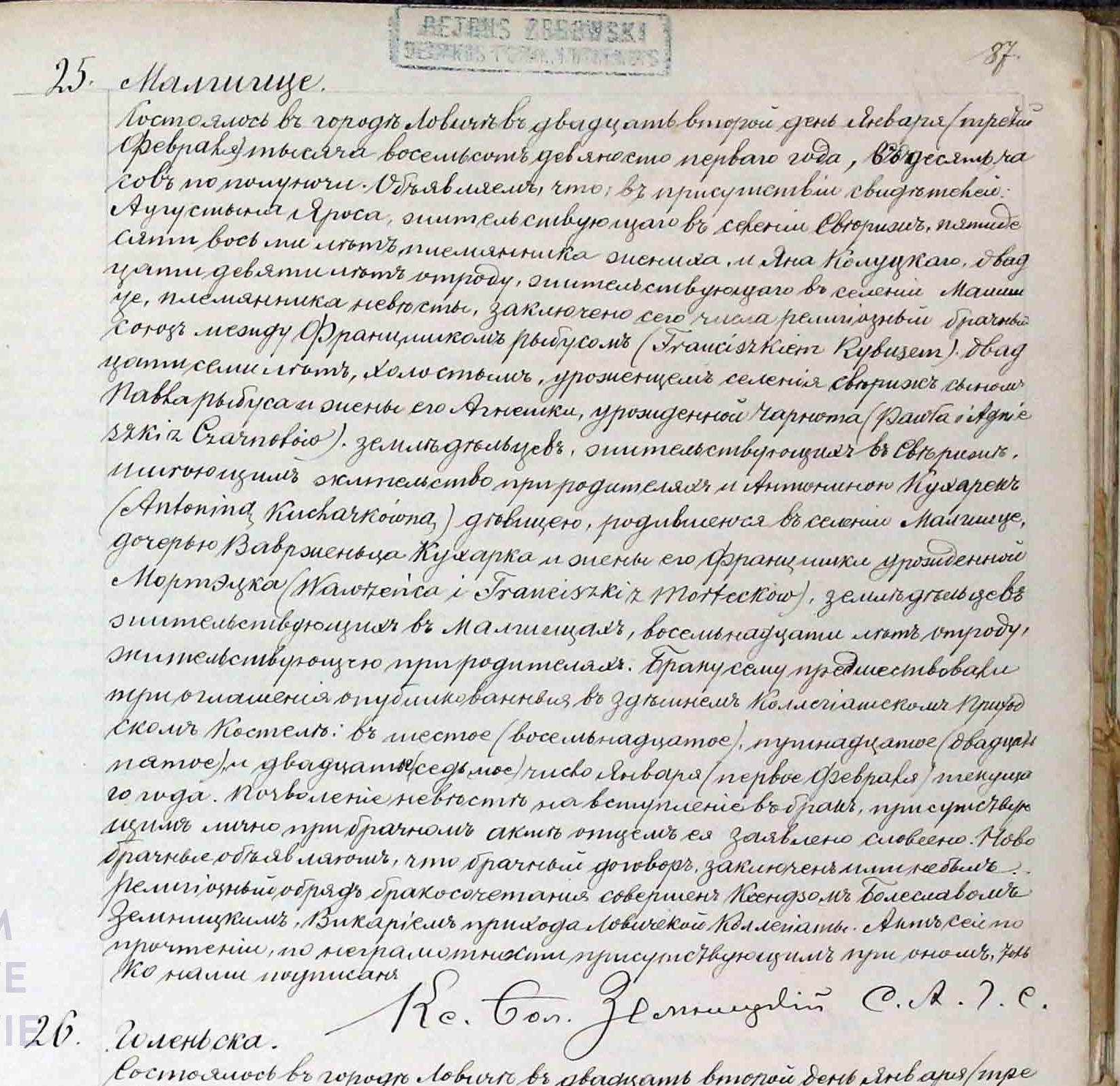 | gr.4396 | sw.1331085 | gr.4376 (gr.4376) | gr.5264 (gr.5264) | Akt małżeństwa: Łowicz Kolegiata (obecn. woj. łódz.), 25/1891 [indeks na http://geneteka.genealodzy.pl/] http://metryki.genealodzy.pl/metryki.php?op=kt&ar=11&zs=0300d&sy=1891&kt=2 [podgląd] |