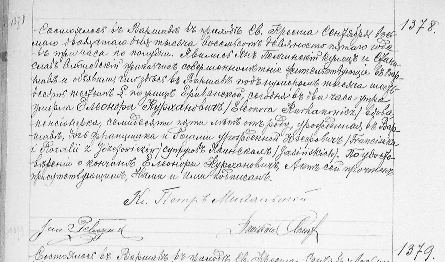 | genetekaz.11417372 | 20 | sep | 1895 | | xpar.1450 | Akt zgonu: Warszawa św. Krzyż (obecn. m. Warszawa), 1378/1895 http://localhost/mjm/krzyz_1895_161_128_0861.jpg [podglad] | | Akt zgonu obecny w bazie Geneteka |