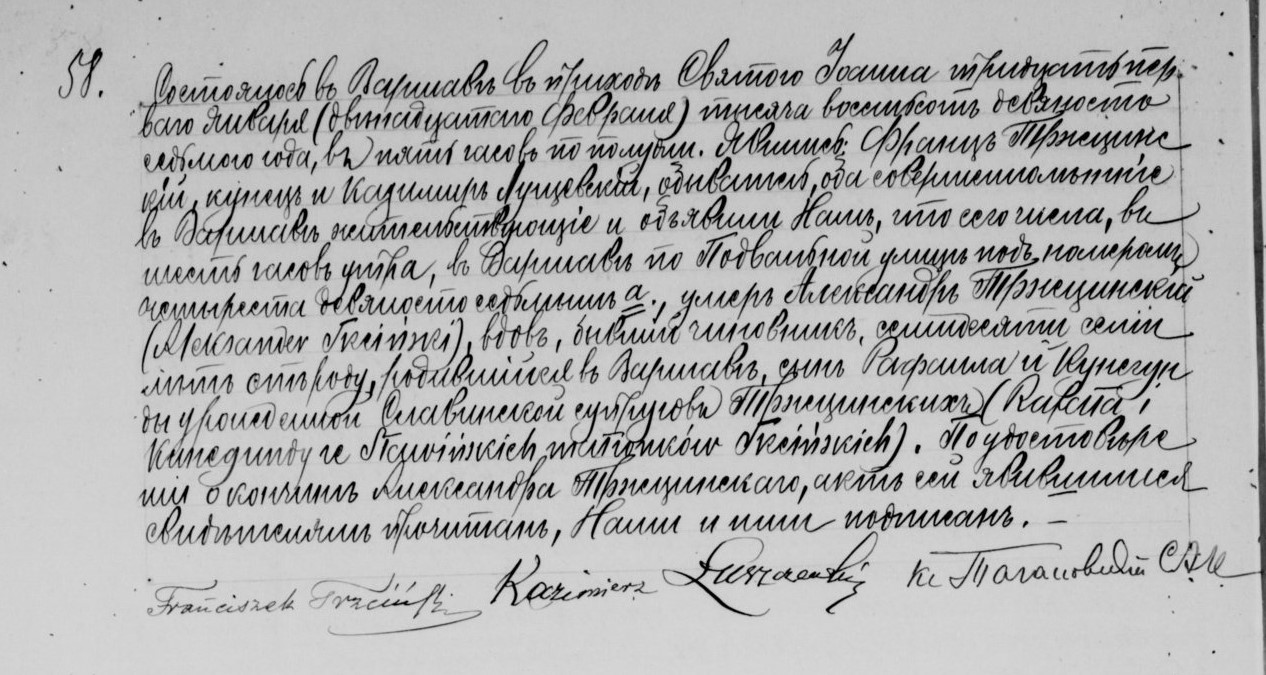 | sw.161323 | m | Aleksander | | | | | Trzciński | | | | | Akt małżeństwa: Warszawa Wsz. Św. (obecn. m. Warszawa), 26/1881 [indeks na http://geneteka.genealodzy.pl/] http://metryki.genealodzy.pl/metryka.php?ar=8&zs=9264d&sy=305&kt=3&skan=026-027.jpg [podgląd] |
