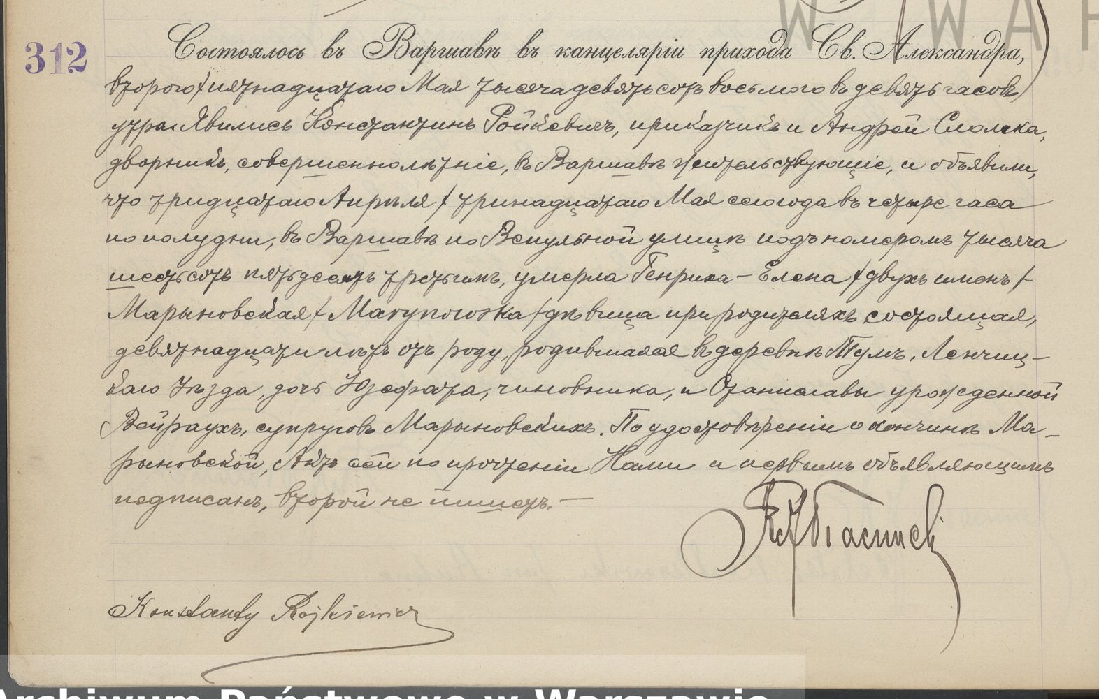 | genetekaz.11344312 | 13 | may | 1908 | | xpar.1442 | Akt zgonu: Warszawa św. Aleksander (obecn. m. Warszawa), 312/1908 http://localhost/mjm/aleksander_1908_159_37_0399.jpg [podglad] | | Akt zgonu obecny w bazie Geneteka |