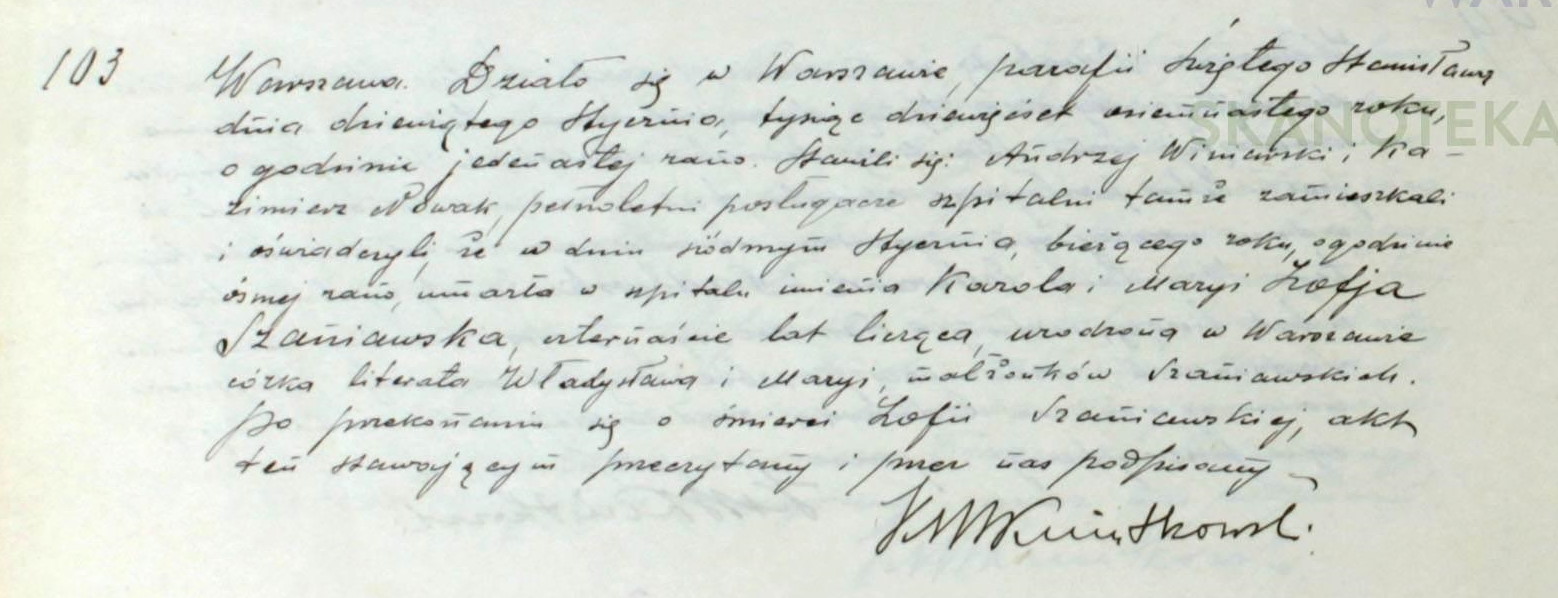 | genetekaz.3445739 | 7 | jan | 1918 | | xpar.1452 | Akt zgonu: Warszawa-Wola św. Stanisław (obecn. m. Warszawa), 103/1918 http://metryki.genealodzy.pl/metryki.php?op=kt&ar=8&zs=9179d&sy=594&kt=1 [podglad] | | Akt zgonu obecny w bazie Geneteka |