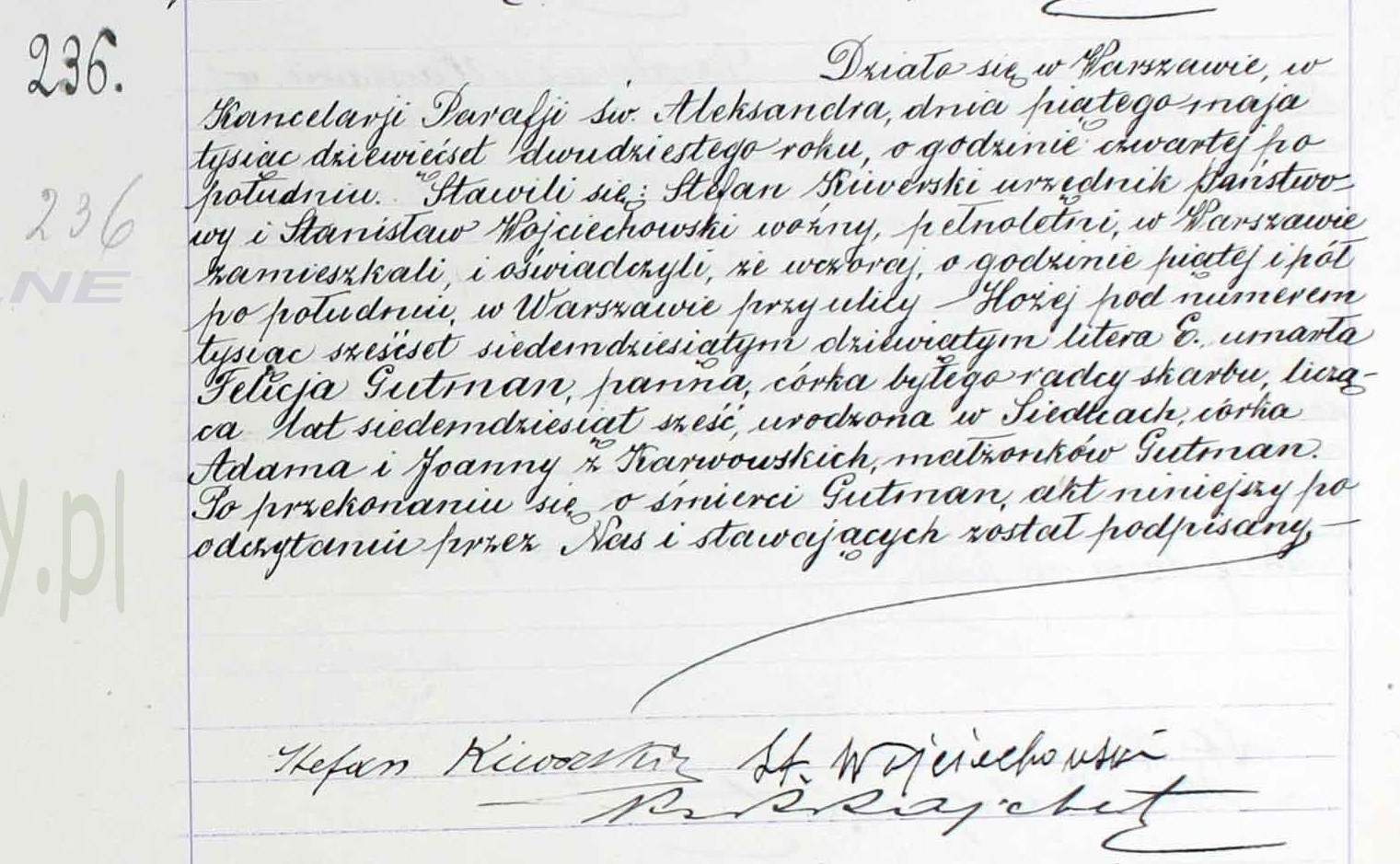 | genetekaz.11456246 | 4 | may | 1920 | | xpar.1442 | Akt zgonu: Warszawa św. Aleksander (obecn. m. Warszawa), 236/1920 http://localhost/mjm/aleksander_1920_232-237.jpg [podglad] | | Akt zgonu obecny w bazie Geneteka |