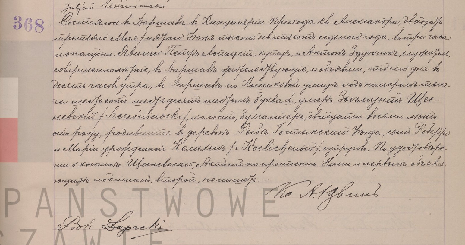 | genetekaz.11343565 | 5 | jun | 1907 | | xpar.1442 | Akt zgonu: Warszawa św. Aleksander (obecn. m. Warszawa), 368/1907 http://localhost/mjm/aleksander_1907_159_35_0382.jpg [podglad] | | Akt zgonu obecny w bazie Geneteka |