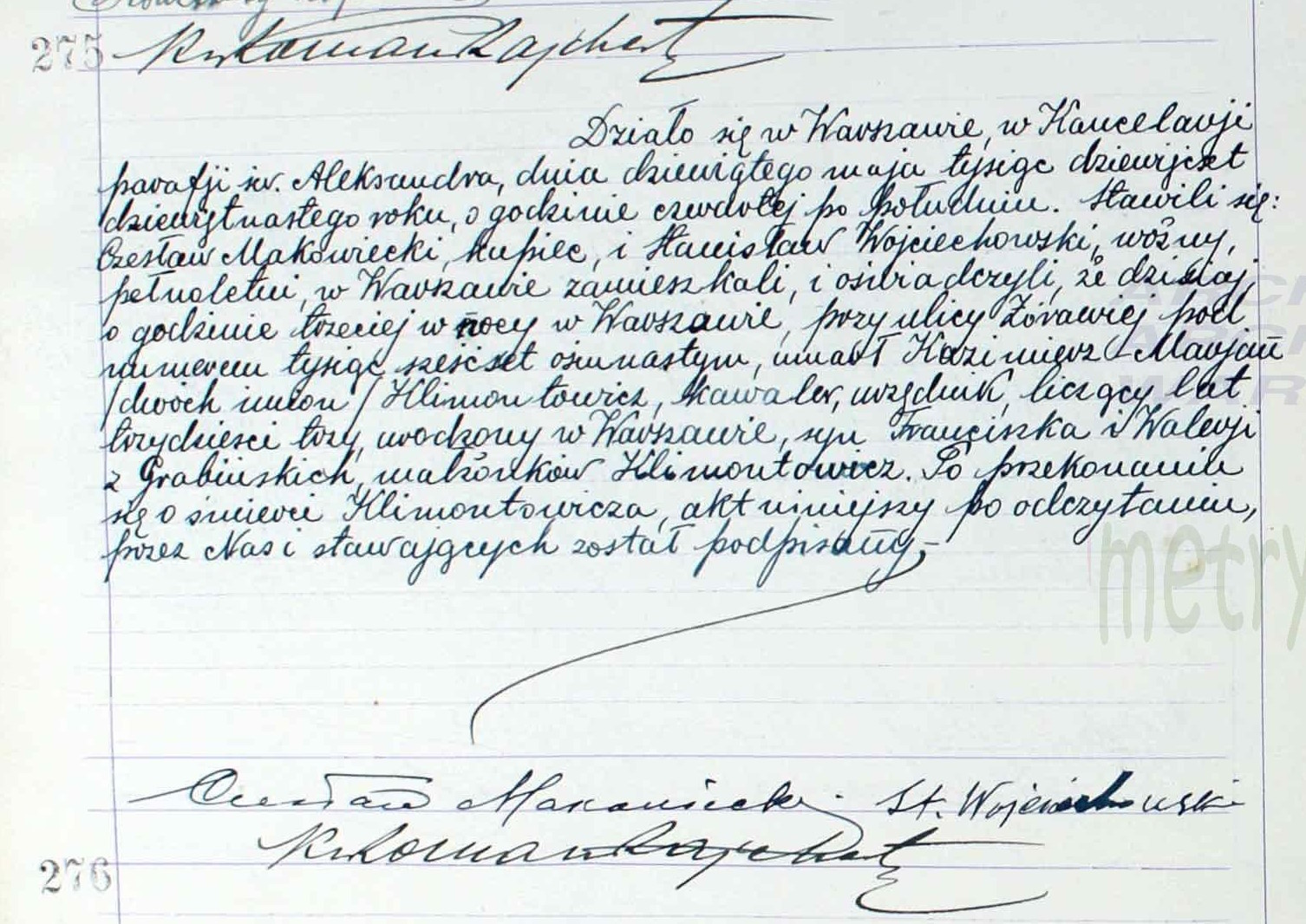 | genetekaz.11455693 | 9 | may | 1919 | | xpar.1442 | Akt zgonu: Warszawa św. Aleksander (obecn. m. Warszawa), 275/1919 http://localhost/mjm/aleksander_1919_274-279.jpg [podglad] | | Akt zgonu obecny w bazie Geneteka |