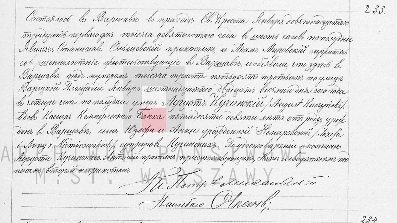 | genetekaz.11246861 | 28 | jan | 1900 | | xpar.1450 | Akt zgonu: Warszawa św. Krzyż (obecn. m. Warszawa), 233/1900 https://szukajwarchiwach.gov.pl/pl/jednostka/-/jednostka/12478035/ [podglad] | | Akt zgonu obecny w bazie Geneteka |