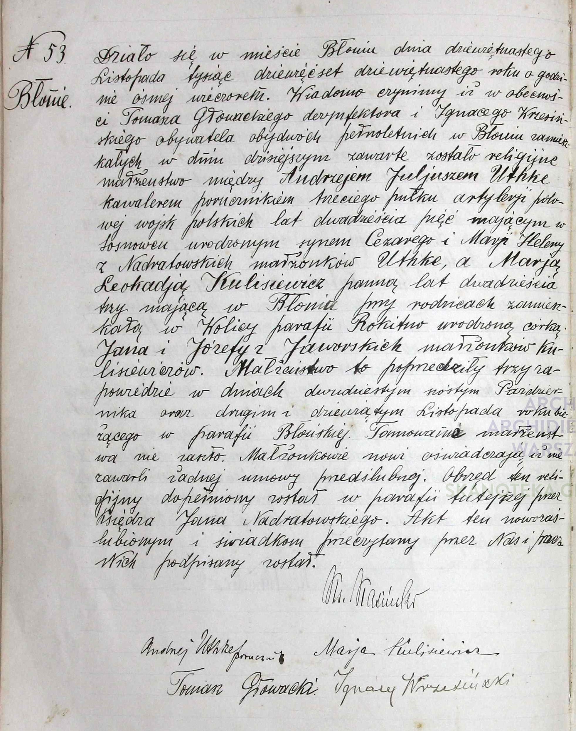 | sw.263397 | m | Jan | Klemens | | | | | | | | | Akt małżeństwa: Błonie (obecn. woj. mazow.), 8/1895 [indeks na http://geneteka.genealodzy.pl/] http://metryki.genealodzy.pl/metryka.php?ar=2&zs=0065d&sy=1895&kt=2&skan=08-09.jpg [podgląd] |