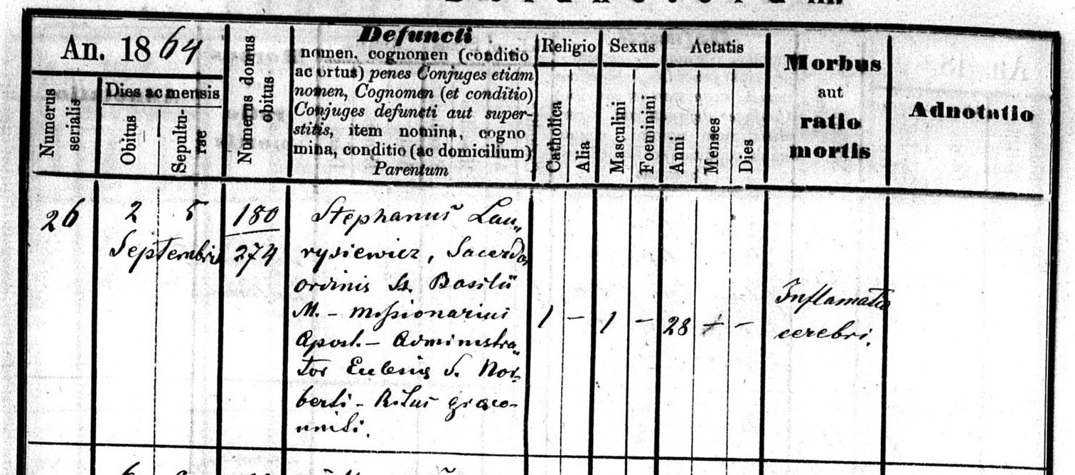 | insertonline.19183 | 2 | sep | 1864 | | | ks. zgonów par. św. Anny nr 26/1864 ; zmarł w wieku 28 lat ; http://szukajwarchiwach.pl/29/323/0/3/Z48/skan/medium/iBV84ILUinQkNRNoH-Ckbw -- Informacja p. Witolda Gogóła (z 1.4.2015) | | Uzupełnienia użytkowników wprowadzane online |