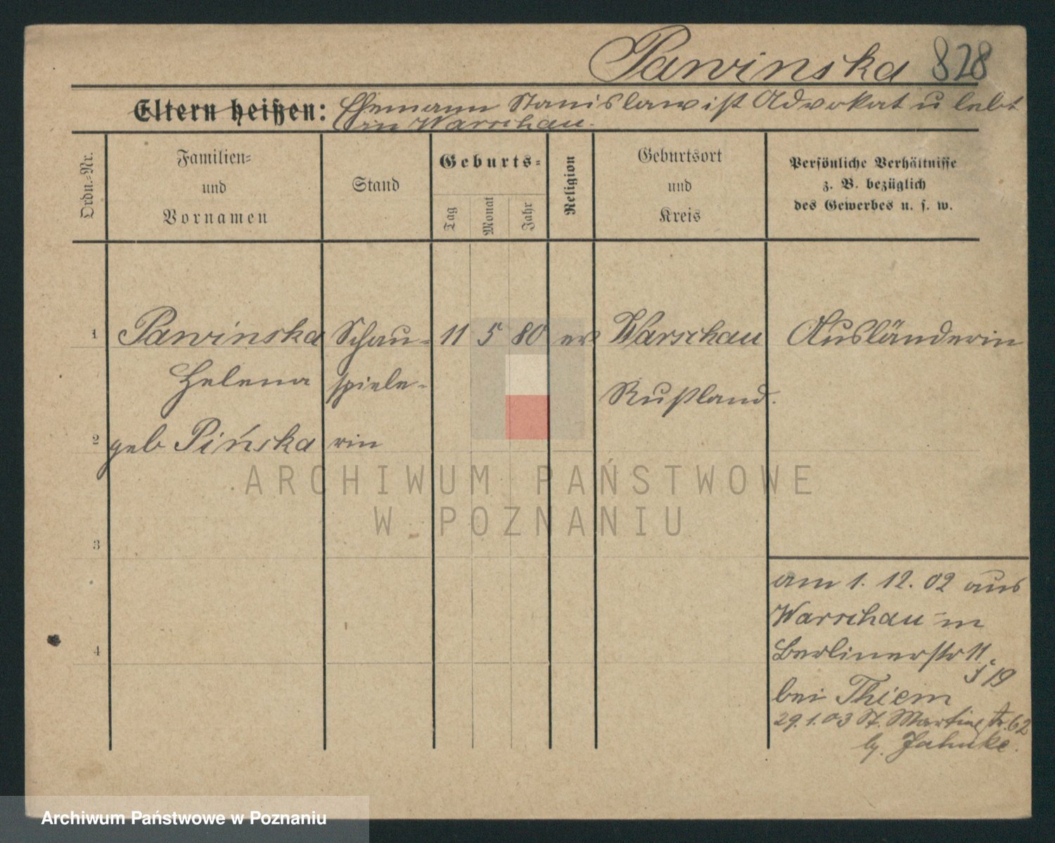 | psb.21922.1 | psb.21923.5 (psb.21923.5) | | | 1899 | | xpar.1442 | Akt małżeństwa: Warszawa św. Aleksander (obecn. m. Warszawa), rok 1899, nr aktu 370 [indeks na http://geneteka.genealodzy.pl/] http://metryki.genealodzy.pl/metryki.php?op=kt&ar=1&zs=0162d&sy=1899b&kt=2 [podgląd] | | | Akt ślubu obecny w bazie Geneteka |