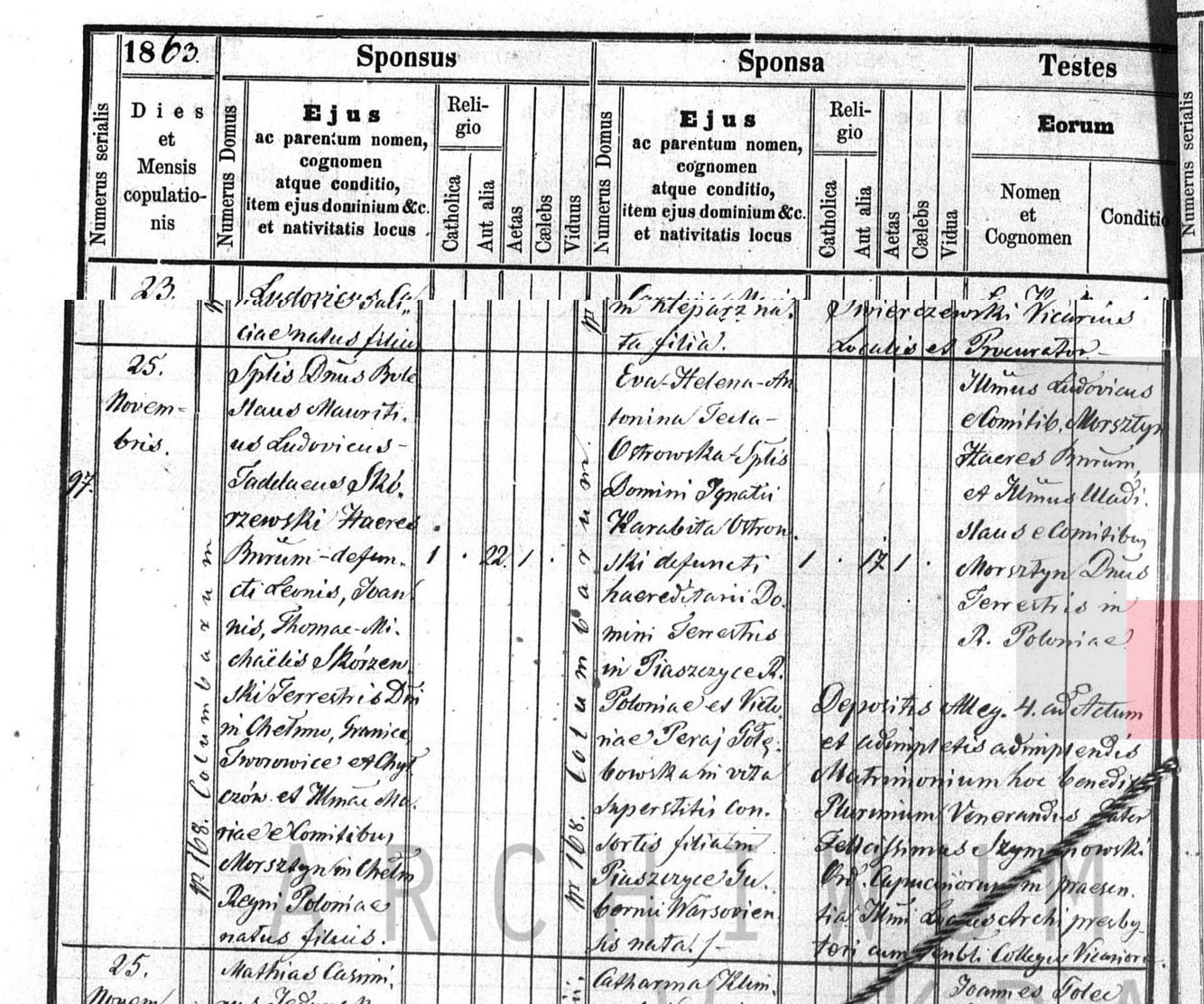 | psb.30228.5 | sw.2595 (sw.2595) | 25 | nov | 1863 | | xpar.481 | Akt małżeństwa: Kraków WNMP (Mariacki) (obecn. woj. małop.), rok 1863, nr aktu 97 [indeks na http://geneteka.genealodzy.pl/] [podgląd] | | | Akt ślubu obecny w bazie Geneteka |