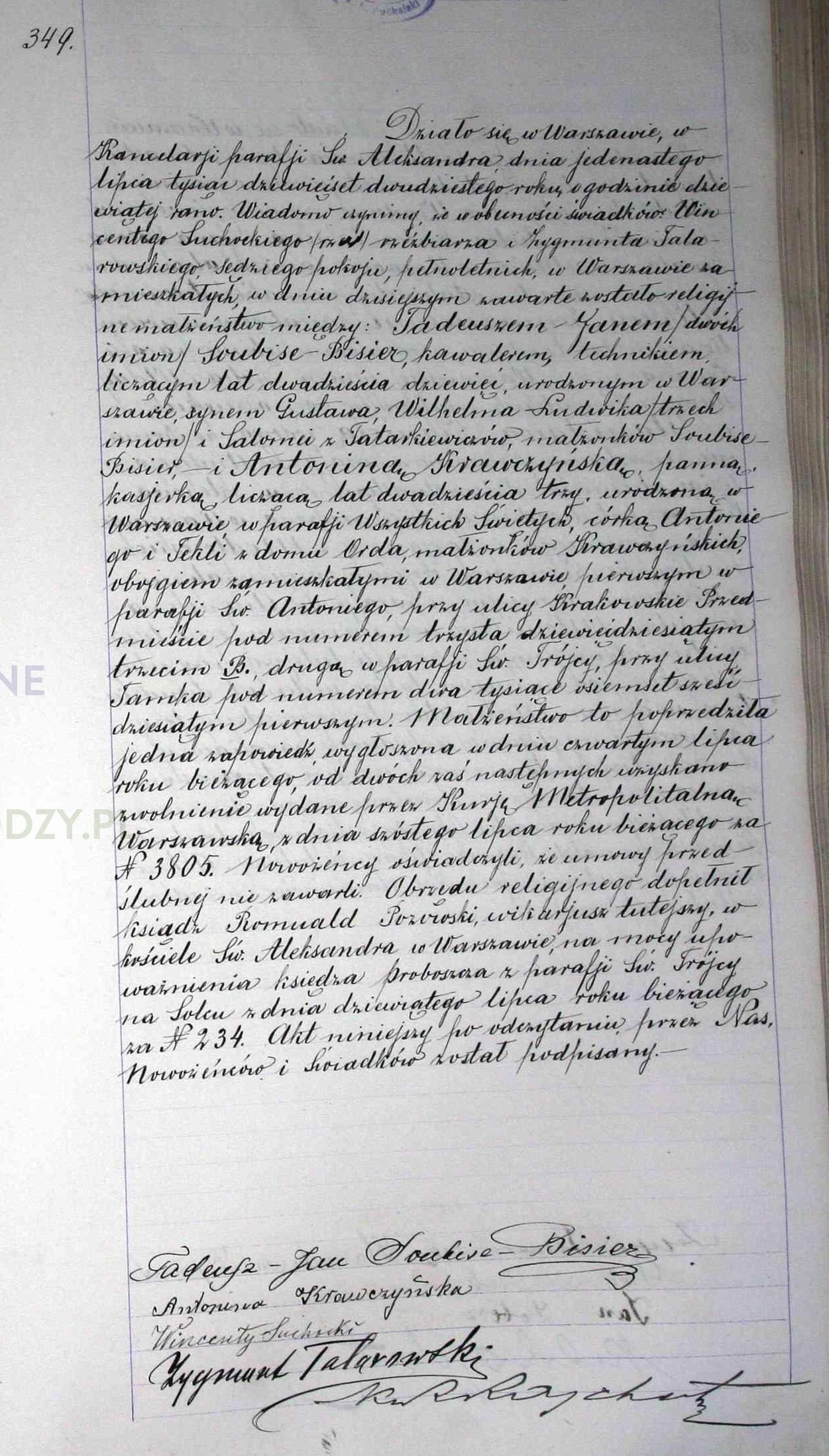 | sw.206935 | f | Salomea | | | | | Tatarkiewicz | | | | | Akt małżeństwa: Warszawa św. Krzyż (obecn. m. Warszawa), 333/1899 [indeks na http://geneteka.genealodzy.pl/] http://metryki.genealodzy.pl/metryki.php?op=kt&ar=1&zs=0158d&sy=1899b&kt=2 [podgląd] |