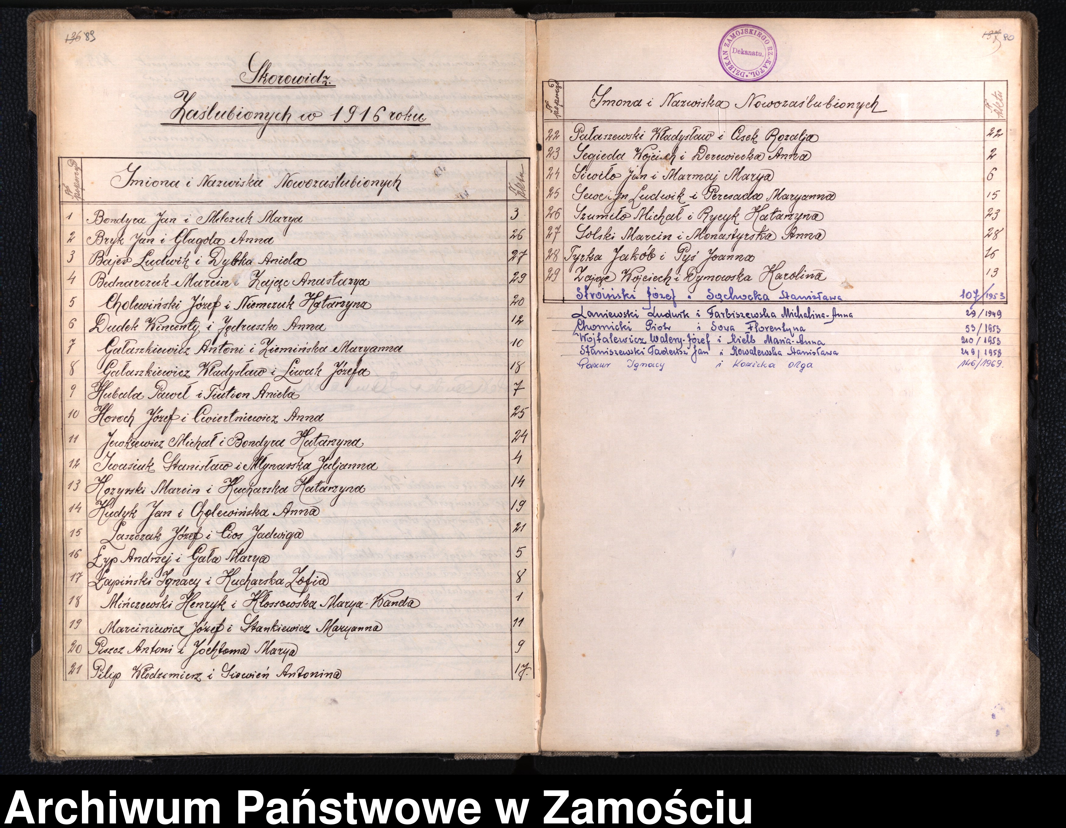 | psb.32350.3 | psb.32350.2 (psb.32350.2) | 1916 | xpar.3622 | Akt małżeństwa: Zamość (obecn. woj. lubel.), rok 1916, nr aktu 1 [indeks na http://geneteka.genealodzy.pl/] https://photos.szukajwarchiwach.gov.pl/277ef259d22ca1f4c8aeb9308b7582846fb215483cf6bc28e9c3ac43ae84a27a_max | Akt ślubu obecny w bazie Geneteka |