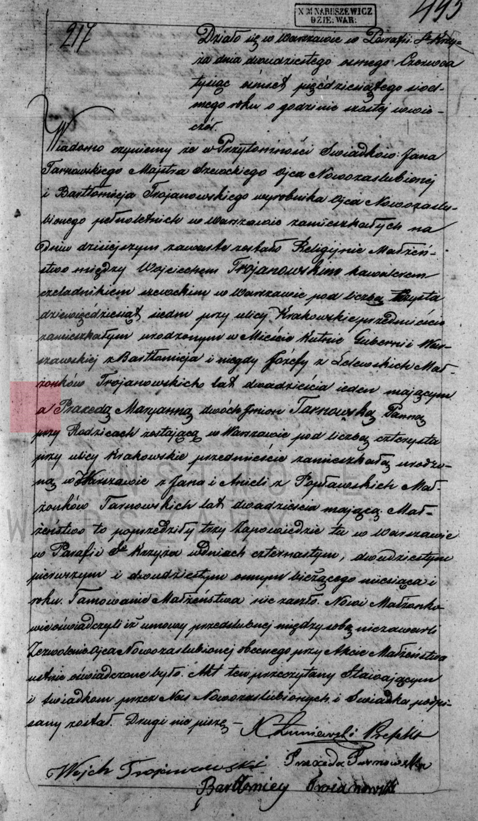 | sw.343516 | sw.343517 (sw.274532) | sw.343518 (sw.274533) | Akt małżeństwa: Warszawa św. Krzyż (obecn. m. Warszawa), 217/1857 [indeks na http://geneteka.genealodzy.pl/] http://metryki.genealodzy.pl/metryki.php?op=kt&ar=1&zs=0158d&sy=1857&kt=2 [podgląd] |